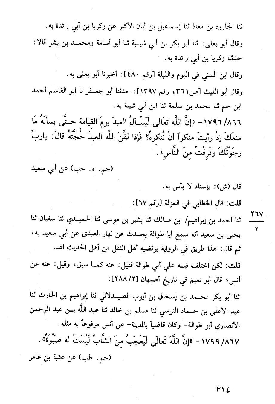 866/ 1796 - "إنَّ اللَّه تعَالى لَيَسْألُ العبدَ يومَ القِيامةِ حتَّى يسألَهُ مَا منعَكَ إذْ رأيتَ منكرًا أنْ تُنكِرهُ؟ فَإذا لقَّنَ اللَّه العبدَ حُجَّتَهُ قالَ: يا ربِّ رجَوْتُكَ وفَرِقْتُ مِنَ النَّاسِ".