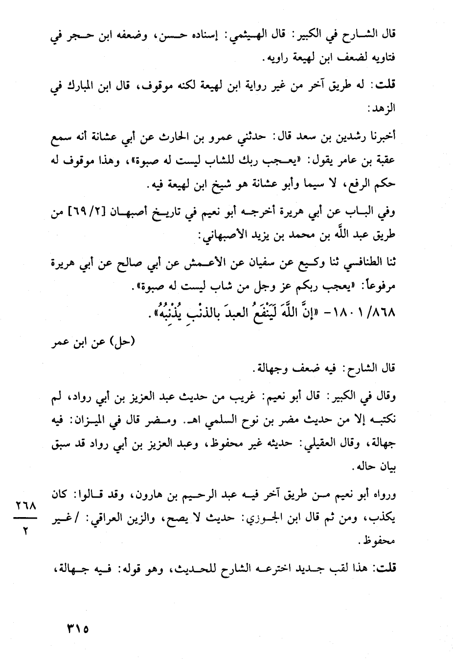 أخبرنا رشدين بن سعد قال: حدثني عمرو بن الحارث عن أبي عشانة أنه سمع عقبة بن عامر يقول: "يعجب ربك للشاب ليست له صبوة"، وهذا موقوف له حكم الرفع، لا سيما وأبو عشانة هو شيخ ابن لهيعة فيه.