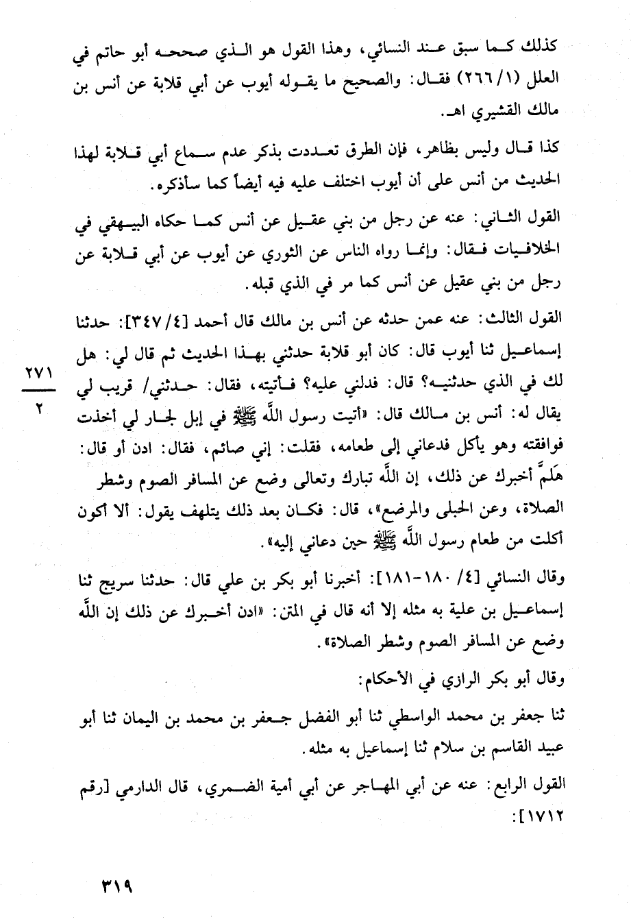 القول الثالث: عنه عمن حدثه عن أنس بن مالك قال أحمد [4/ 347]: حدثنا إسماعيل ثنا أيوب قال: كان أبو قلابة حدثني بهذا الحديث ثم قال لي: هل لك في الذي حدثنيه؟ قال: فدلني عليه؟ فأتيته، فقال: حدثني قريب لي يقال له: أنس بن مالك قال: "أتيت رسول اللَّه -صلى اللَّه عليه وسلم- في إبل لجار لي أخذت فوافقته وهو يأكل فدعاني إلى طعامه، فقلت: إني صائم، فقال: ادن أو قال: هَلمَّ أخبرك عن ذلك، إن اللَّه تبارك وتعالى وضع عن المسافر الصوم وشطر الصلاة، وعن الحبلى والمرضع"، قال: فكان بعد ذلك يتلهف يقول: ألا أكون أكلت من طعام رسول اللَّه -صلى اللَّه عليه وسلم- حين دعاني إليه".