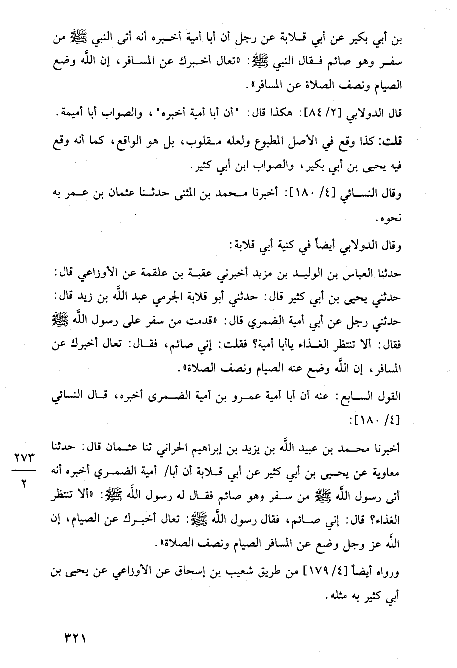 حدثنا العباس بن الوليد بن مؤيد أخبرني عقبة بن علقمة عن الأوزاعي قال: حدثني يحيى بن أبي كثير قال: حدثني أبو قلابة الجرمي عبد اللَّه بن زيد قال: حدثني رجل عن أبي أمية الضمري قال: "قدمت من سفر على رسول اللَّه -صلى اللَّه عليه وسلم- فقال: ألا تنتظر الغذاء يا أبا أمية؟ فقلت: إني صائم، فقال: تعال أخبرك عن المسافر، إن اللَّه وضع عنه الصيام ونصف الصلاة".