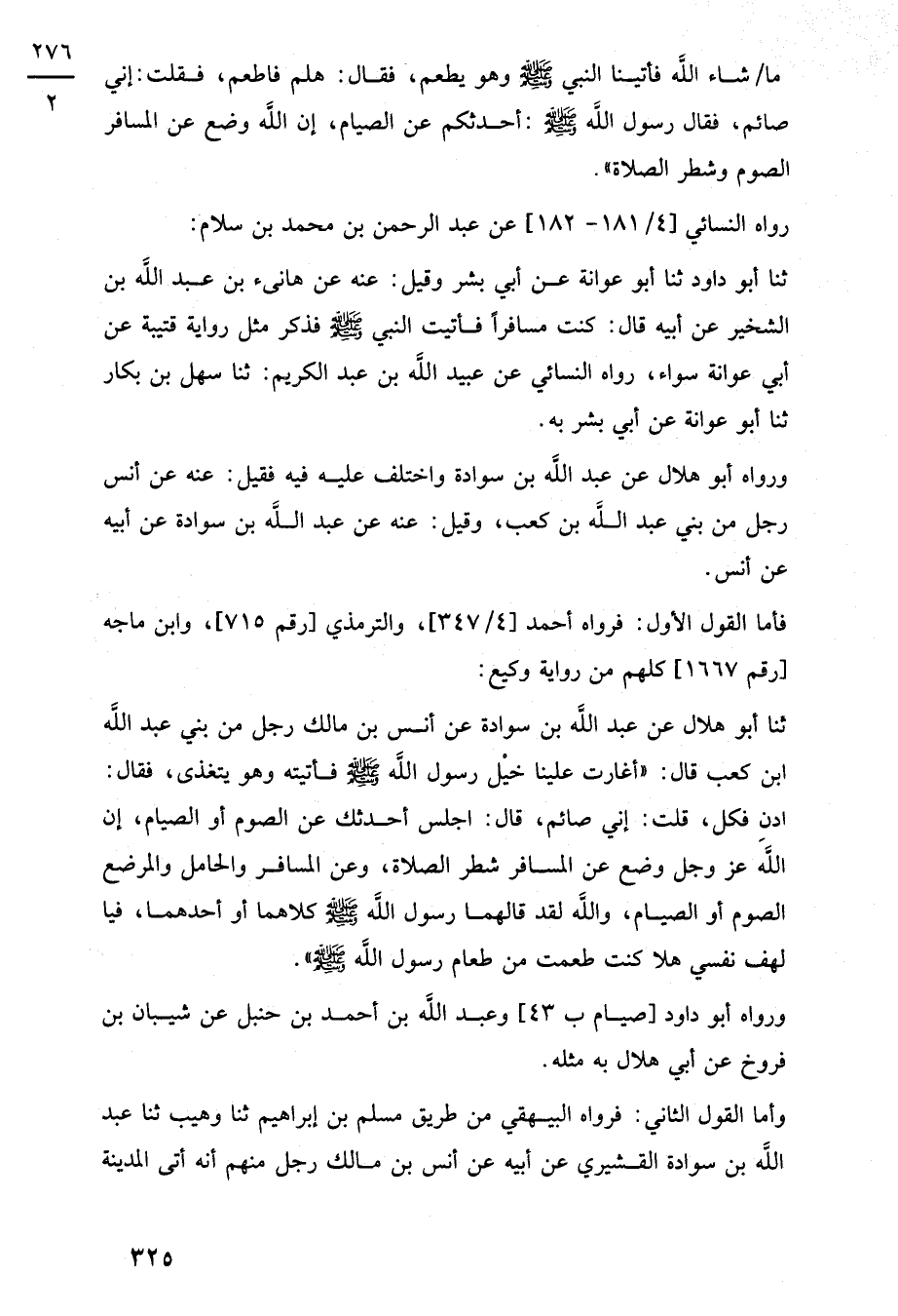 ثنا أبو هلال عن عبد اللَّه بن سوادة عن أنس بن مالك رجل من بنى عبد اللَّه ابن كعب قال: "أغارت علينا خيْل رسول اللَّه -صلى اللَّه عليه وسلم- فأتيته وهو يتغذى، فقال: ادن فكل، قلت: إني صائم، قال: اجلس أحدثك عن الصوم أو الصيام، إن اللَّه عز وجل وضع عن المسافر شطر الصلاة، وعن المسافر والحامل والمرضع الصوم أو الصيام، والقَه لقد قالهما رسول اللَّه -صلى اللَّه عليه وسلم- كلاهما أو أحدهما، فيا لهف نفسي هلا كنت طعمت من طعام رسول اللَّه -صلى اللَّه عليه وسلم-".