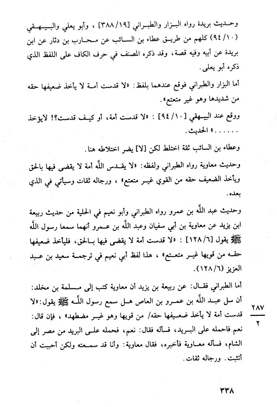 وحديث عبد اللَّه بن عمرو رواه الطبراني وأبو نعيم في الحلية من حديث ربيعة ابن يزيد عن معاوية بن أبي سفيان وعبد اللَّه بن عمرو أنهما سمعا رسول اللَّه -صلى اللَّه عليه وسلم- يقول [6/ 128]: "لا قدست أمة لا يقضى فيها بالحق، فليأخذ ضعيفها حقه من قويها غير متعتع"، هذا لفظ أبي نعيم في ترجمة سعيد بن عبد العزيز (6/ 128).