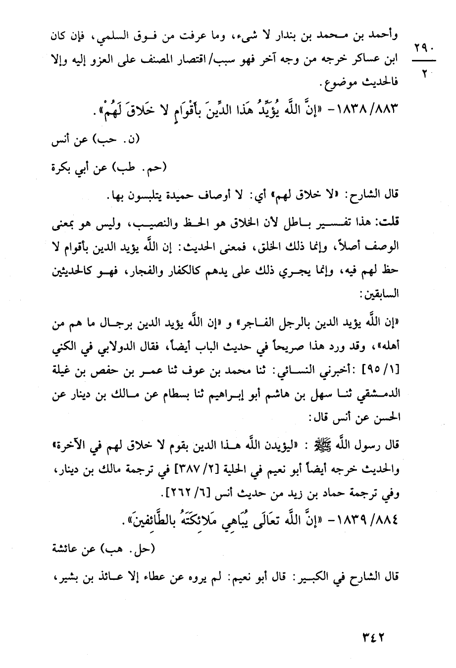 883/ 1838 - "إنَّ اللَّه يُؤَيِّدُ هَذا الدِّينَ بأَقْوَامٍ لا خَلاقَ لَهُمْ".
