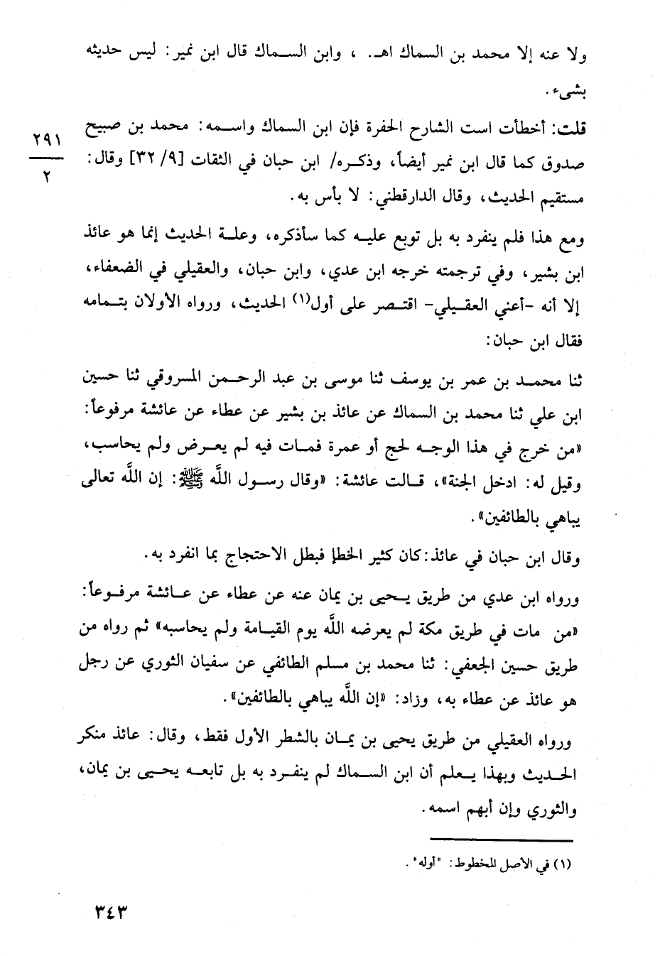 ثنا محمد بن عمر بن يوسف ثنا موسى بن عبد الرحمن المسروقي ثنا حسين ابن علي ثنا محمد بن السماك عن عائذ بن بشير عن عطاء عن عائشة مرفوعًا: "من خرج في هذا الوجه لحج أو عمرة فمات فيه لم يعرض ولم يحاسب، وقيل له: ادخل الجنة"، قالت عائشة: "وقال رسول اللَّه -صلى اللَّه عليه وسلم-: إن اللَّه تعالى يباهي بالطائفين".