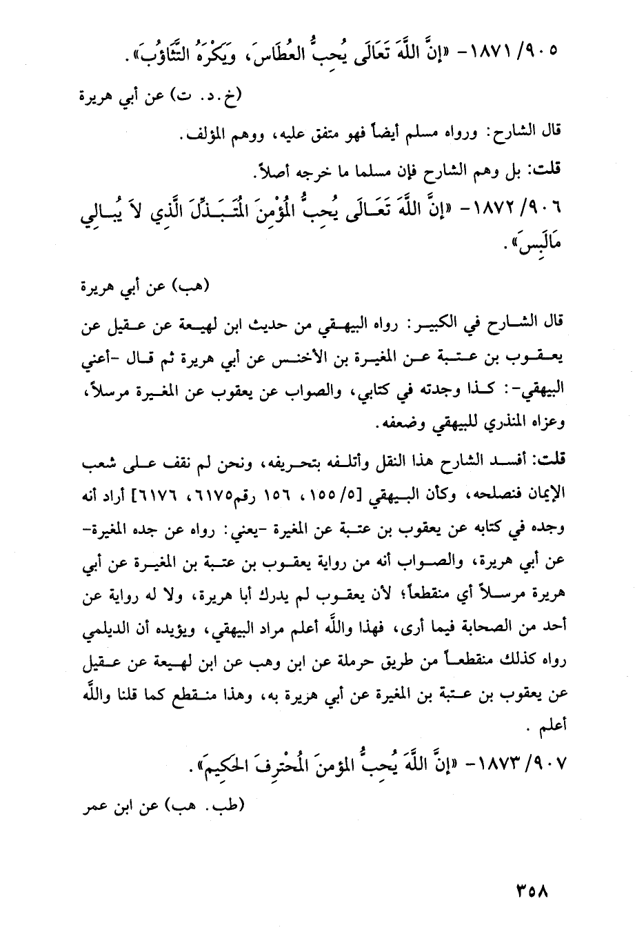 905/ 1871 - "إنَّ اللَّه تَعَالَى يُحِبُّ العُطَاسَ، وَيَكْرَهُ التَّثَاؤُبَ".