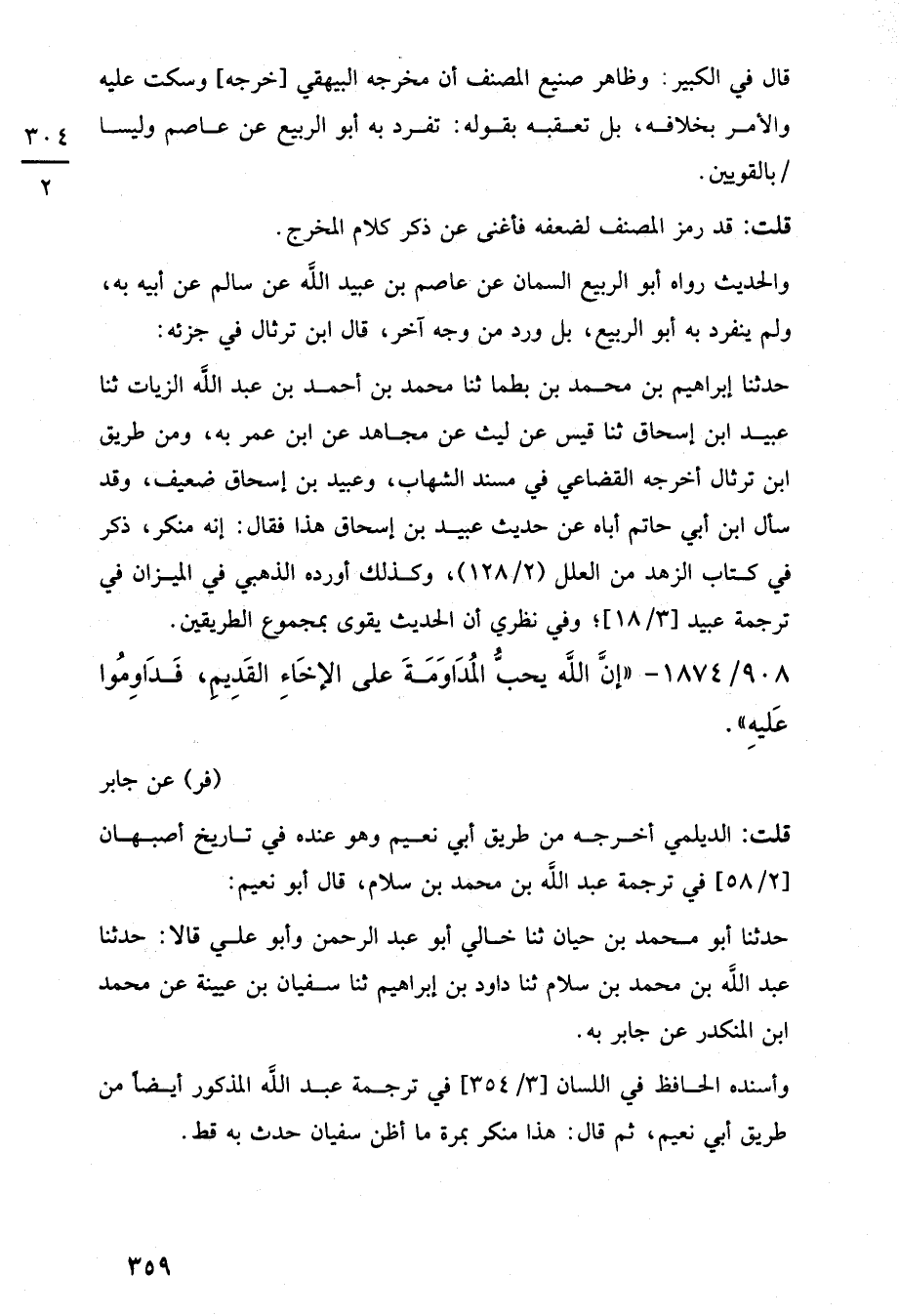 والحديث رواه أبو الربيع السمان عن عاصم بن عبيد اللَّه عن سالم عن أبيه به، ولم ينفرد به أبو الربيع، بل ورد من وجه آخر، قال ابن ترثال في جزئه: