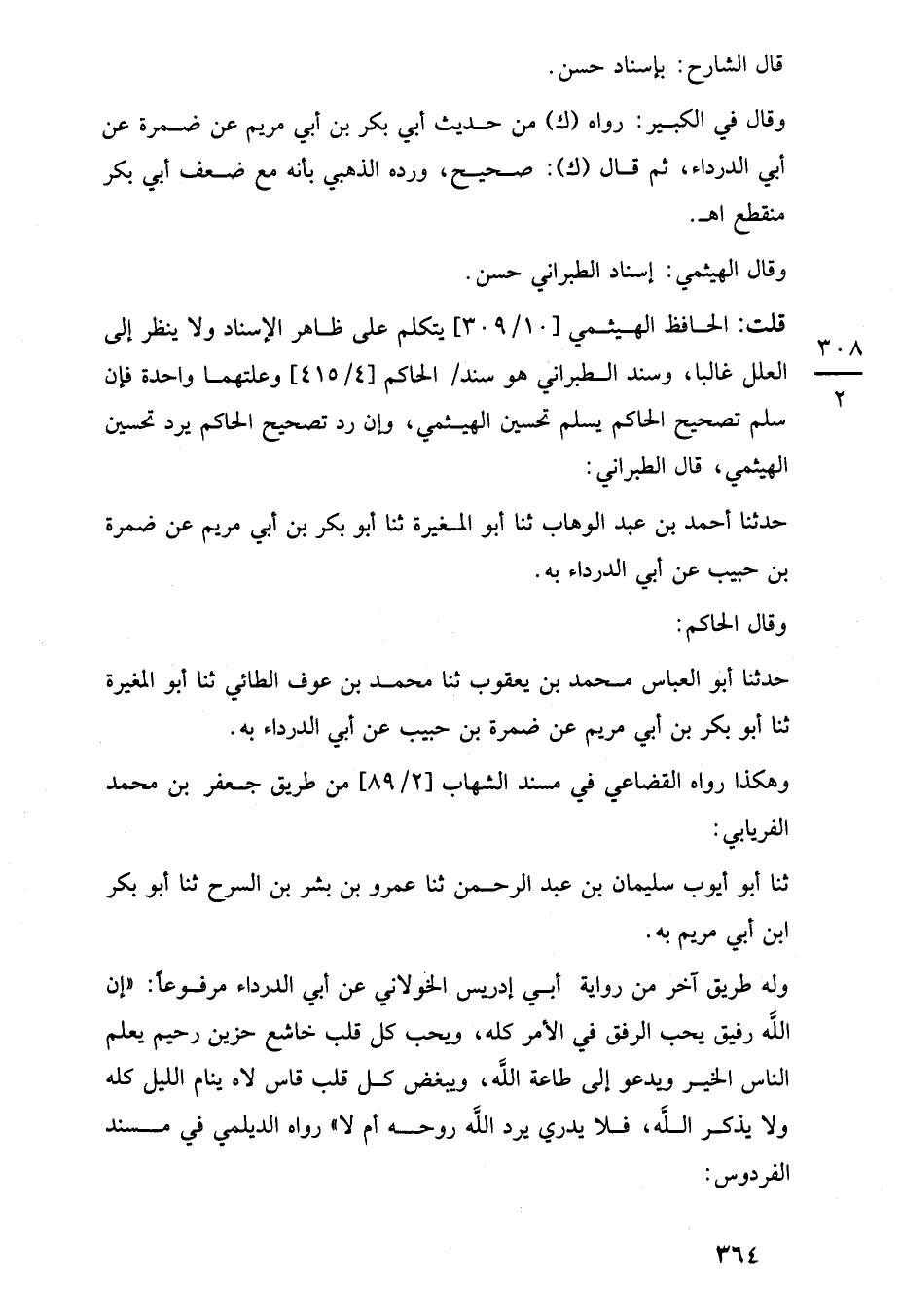 قلت: الحافظ الهيثمي [10/ 309] يتكلم على ظاهر الإسناد ولا ينظر إلى العلل غالبا، وسند الطبراني هو سند الحاكم [4/ 415] وعلتهما واحدة فإن سلم تصحيح الحاكم يسلم تحسين الهيثمي، وإن رد تصحيح الحاكم يرد تحسين الهيثمي، قال الطبراني: