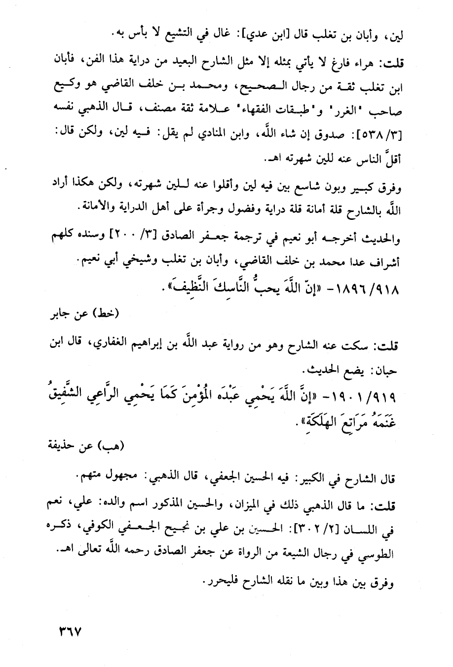قلت: هراء فارغ لا يأتي بمثله إلا مثل الشارح البعيد من دراية هذا الفن، فأبان ابن تغلب ثقة من رجال الصحيح، ومحمد بن خلف القاضي هو وكيع صاحب "الغوز" و"طبقات الفقهاء" علامة ثقة مصنف، قال الذهبي نفسه [3/ 538]: صدوق إن شاء اللَّه، وابن المنادي لم يقل: فيه لين، ولكن قال: أقل الناس عنه للين شهرته اهـ.