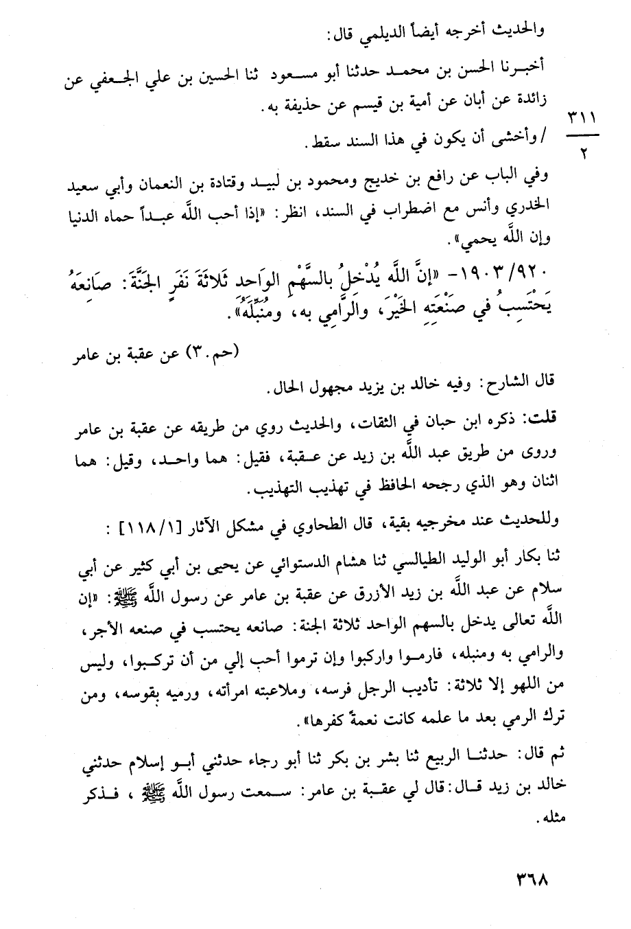 ثنا بكار أبو الوليد الطيالسي ثنا هشام الدستوائى عن يحيى بن أبي كثير عن أبي سلام عن عبد اللَّه بن زيد الأزرق عن عقبة بن عامر عن رسول اللَّه -صلى اللَّه عليه وسلم-: "إن اللَّه تعالى يدخل بالسهم الواحد ثلاثة الجنة: صانعه يحتسب في صنعه الأجر، والرامي به ومنبله، فارموا واركبوا وإن ترموا أحب إلي من أن تركبوا، وليس من اللهو إلا ثلاثة: تأديب الرجل فرسه، وملاعبته امرأته، ورميه يقوسه، ومن ترك الرمي بعد ما علمه كانت نعمةً كفرها".