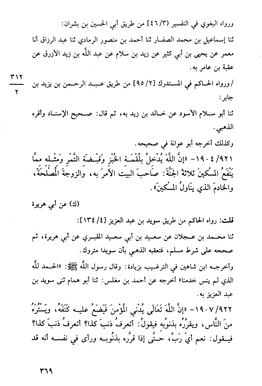 921/ 1904 - "إنَّ اللَّه يُدْخِلُ بلُقْمَةِ الخُبْزِ وَقبْضَةِ التَّمْرِ وَمثْلِهِ مِمَّا يَنْفَعُ المسْكينَ ثلاثةً الجَنَّةَ: صَاحبَ البيت الأمر به، والزوجةَ المُصْلَحَةَ، والخادمَ الذي ينَاولُ المسْكينَ".