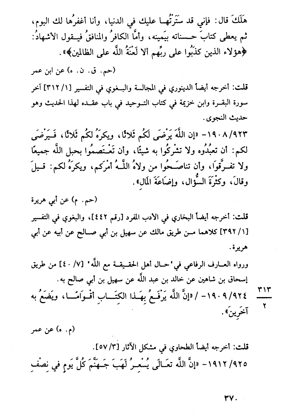 923/ 1908 - "إِنَّ اللَّه يَرْضَى لكُم ثَلاثًا، ويكرَهُ لكُم ثَلاثًا، فَيَرْضَى لكم: أن تعبُدُوه ولا تشْركُوا به شيئًا، وأن تَعْتَصمُوا بحبل اللَّه جميعًا ولا تفرَّقوَا، وأن تناصَحُوا من ولاهُ اللَّهُ أمْرَكم، ويكرَهُ لكم: قيلَ وقالَ، وكثْرَةَ السُّؤال، وإضَاعَةَ المَالِ".