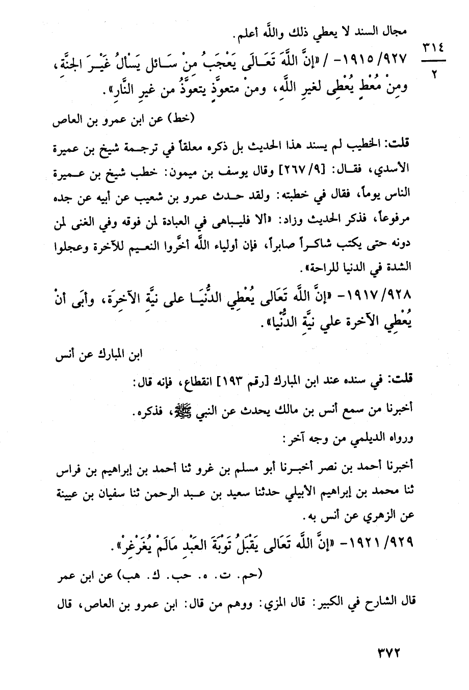 927/ 1915 - "إِنَّ اللَّهَ تَعَالَى يَعْجَبُ مِنْ سَائل يَسألُ غَيْرَ الجنَّةِ، ومِنْ مُعْطٍ يُعْطِى لغيرِ اللَّهِ، ومنْ متعوَّذٍ يتعوَّذُ من غيرِ النَّارِ".