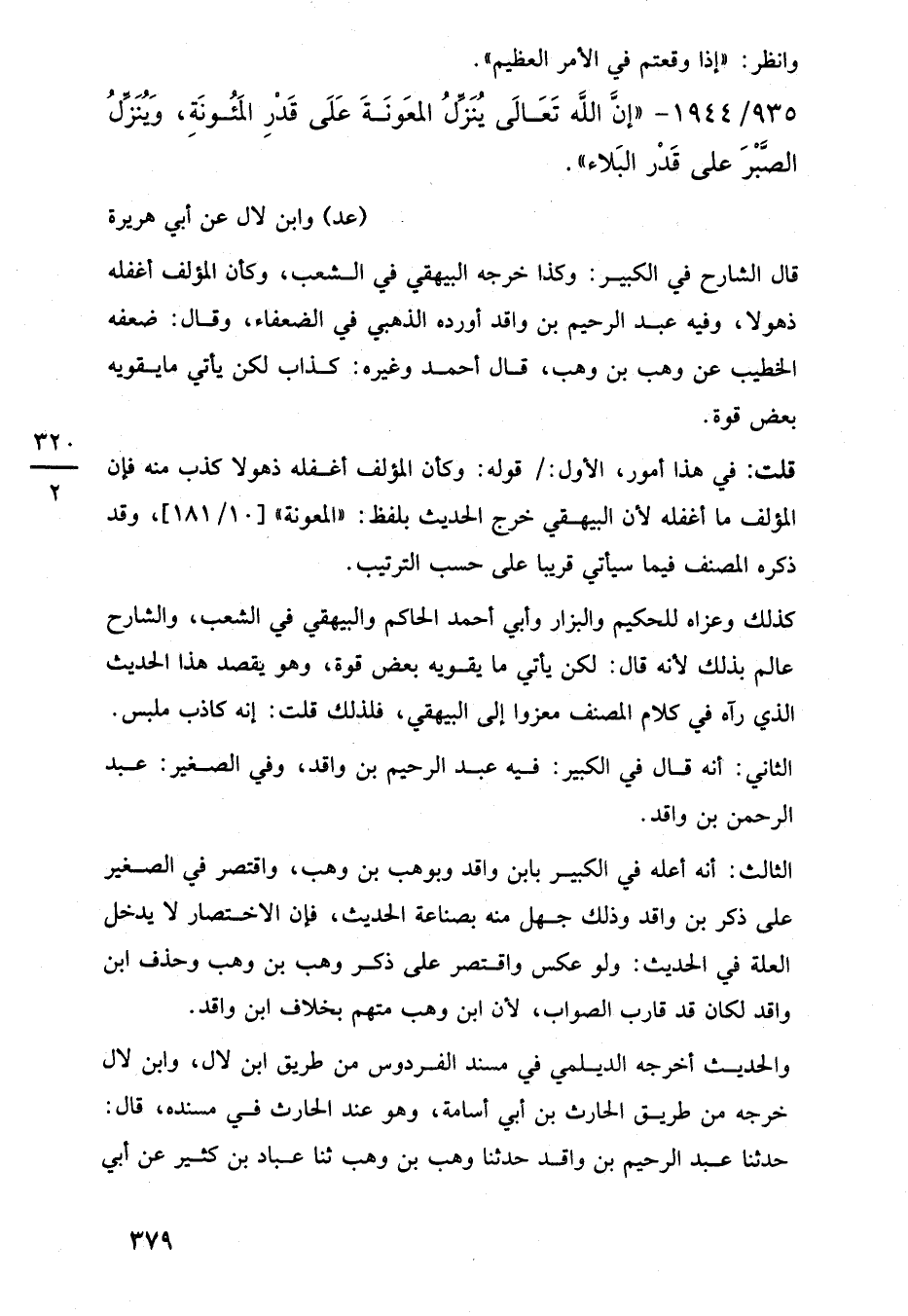 الثالث: أنه أعله في الكبير بابن واقد وبوهب بن وهب، واقتصر في الصغير على ذكر بن واقد وذلك جهل منه بصناعة الحديث، فإن الاختصار لا يدخل العلة في الحديث: ولو عكس واقتصر على ذكر وهب بن وهب وحذف ابن واقد لكان قد قارب الصواب، لأن ابن وهب متهم بخلاف ابن واقد.