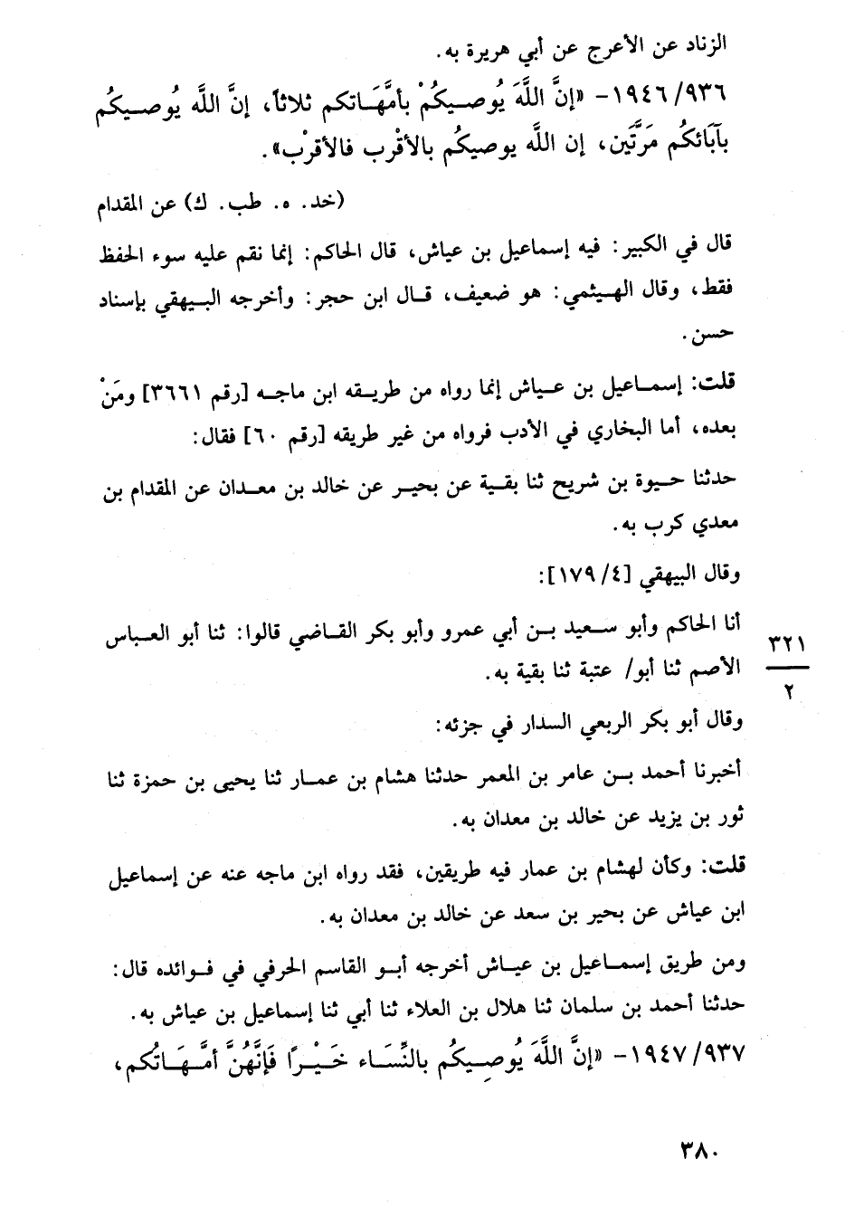 936/ 1946 - "إنَّ اللَّه يُوصيكُمْ بأمَّهَاتكم ثلاثا، إنَّ اللَّه يُوصيكُم بآبَائكُم مَرَّتَين، إن اللَّه يوصيكُم بالأقْرب فالأقرْب".