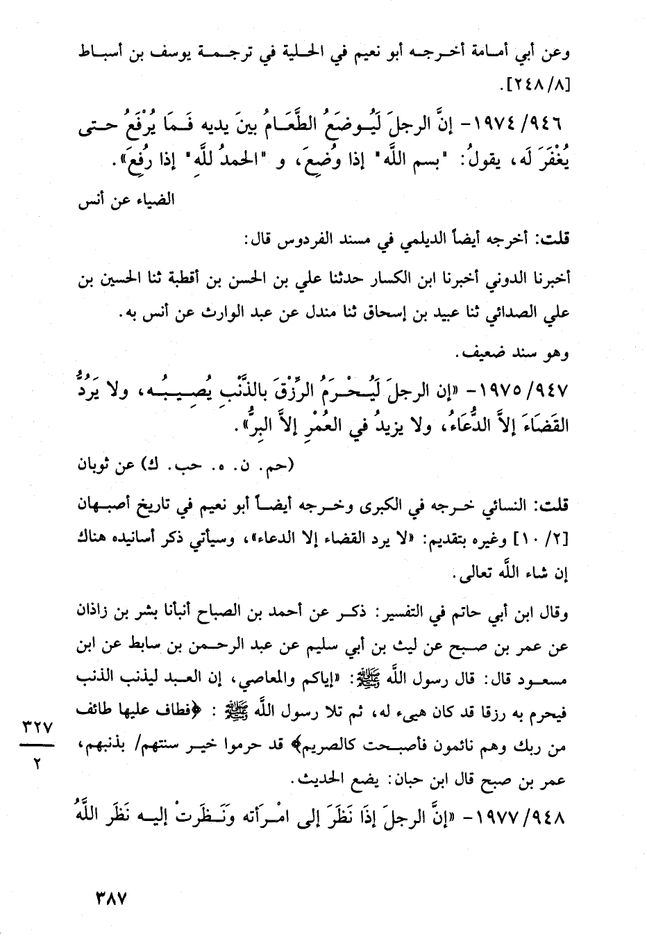 947/ 1975 - "إِنَّ الرجلَ لَيُحْرَمُ الرِّزْقَ بالذَّنْبِ يُصِيبُه، ولا يَرُدُّ القَضَاءَ إلا الدُّعَاء ولا يزيدُ في العُمْرِ إلَّا البِرُّ".