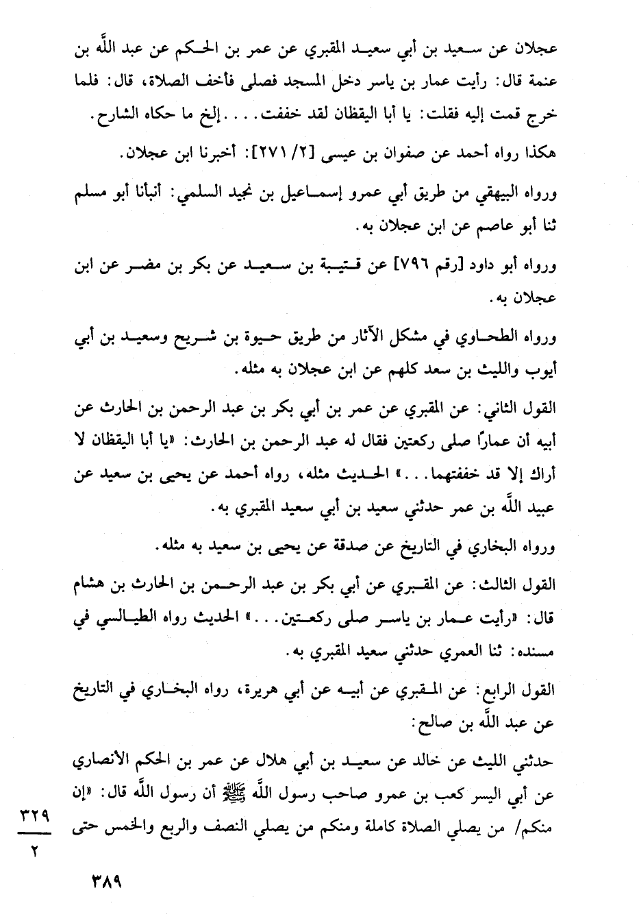 عجلان عن سعيد بن أبي سعيد المقبري عن عمر بن الحكم عن عبد اللَّه بن عنمة قال: رأيت عمار بن ياسر دخل المسجد فصلى فأخف الصلاة، قال: فلما خرج قمت إليه فقلت: يا أبا اليقظان لقد خففت. . . إلخ ما حكاه الشارح.