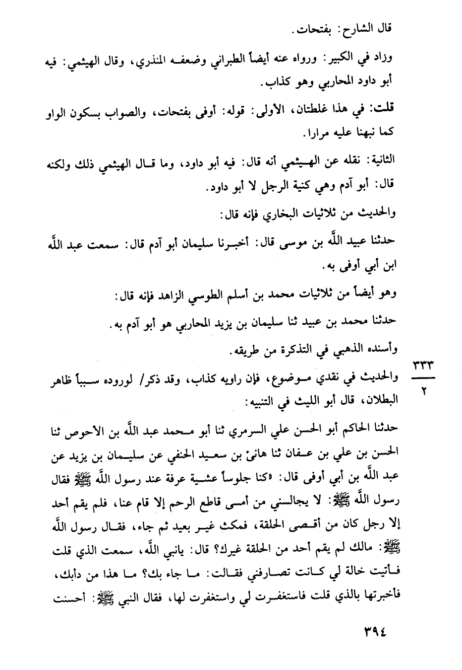 حدثنا الحاكم أبو الحسن علي السرمري ثنا أبو محمد عبد اللَّه بن الأحوص ثنا الحسن بن علي بن عفان ثنا هانئ بن سعيد الحنفي عن سليمان بن يزيد عن عبد اللَّه بن أبي أوفى قال: "كنا جلوسًا عشية عرفة عند رسول اللَّه -صلى اللَّه عليه وسلم- فقال رسول اللَّه -صلى اللَّه عليه وسلم-: لا يجالسني من أمسى قاطع الرحم إلا قام عنا، فلم يقم أحد إلا رجل كان من أقصى الحلقة، فمكث غير بعيد ثم جاء، فقال رسول اللَّه -صلى اللَّه عليه وسلم-: مالك لم يقم أحد من الحلقة غيرك؟ قال: يا نبي اللَّه، سمعت الذي قلت فأتيت خالة لي كانت تصارفني فقالت: ما جاء بك؟ ما هذا من دأبك، فأخبرتها بالذي قلت فاستغفرت لي واستغفرت لها، فقال النبي -صلى اللَّه عليه وسلم-: أحسنت