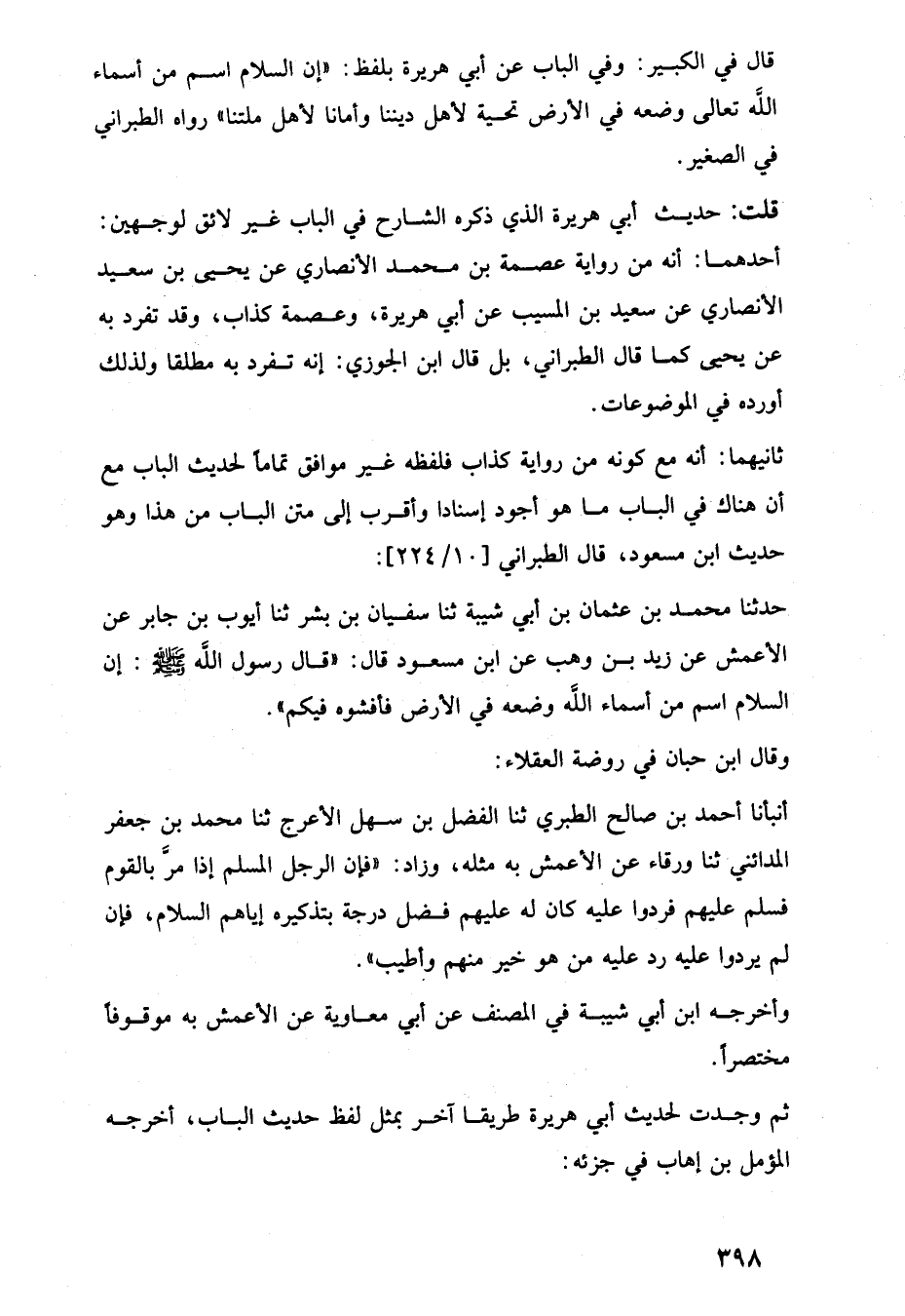 قال في الكبير: وفي الباب عن أبي هريرة بلفظ: "إن السلام اسم من أسماء اللَّه تعالى وضعه في الأرض تحية لأهل ديننا وأمانا لأهل ملتنا" رواه الطبراني في الصغير.