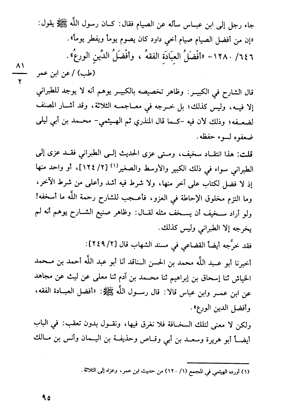 646/ 1280 - "أَفْضَلُ العِبَادَةِ الفقهُ، وأَفْضَلُ الدِّينِ الورعُ". (طب) عن ابن عمر