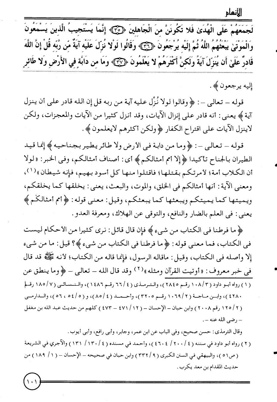 {لجمعهم على الْهدى فَلَا تكونن من الْجَاهِلين (35) إِنَّمَا يستجيب الَّذين يسمعُونَ والموتى يَبْعَثهُم الله ثمَّ إِلَيْهِ يرجعُونَ (36) وَقَالُوا لَوْلَا نزل عَلَيْهِ آيَة من ربه قل إِن الله قَادر على أَن ينزل آيَة وَلَكِن أَكْثَرهم لَا يعلمُونَ (37) وَمَا من دَابَّة فِي الأَرْض وَلَا طَائِر إِلَيْهِ يرجعُونَ} .