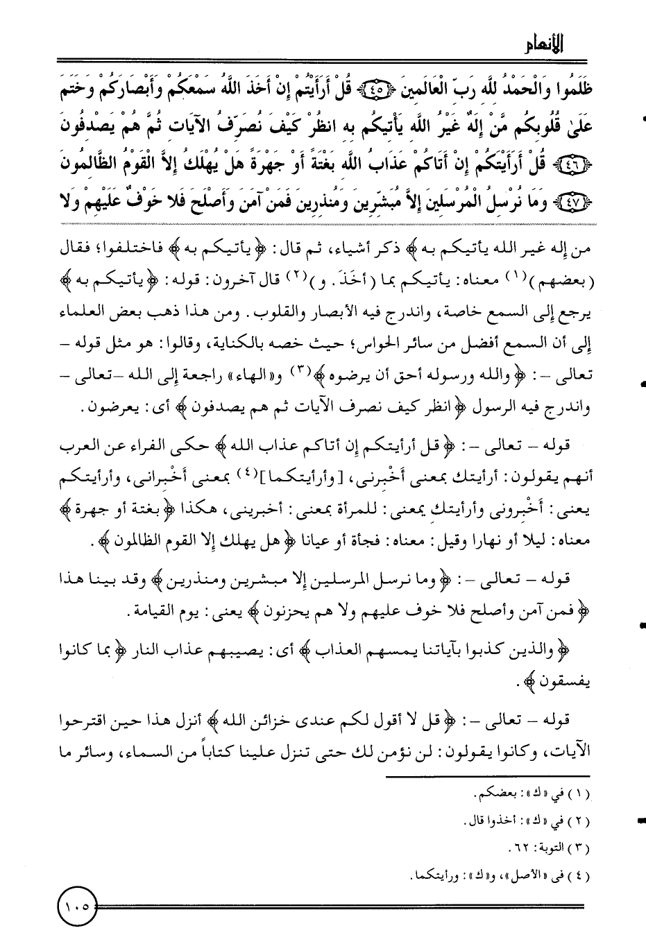 {ظلمُوا وَالْحَمْد لله رب الْعَالمين (45) قل أَرَأَيْتُم إِن أَخذ الله سمعكم وأبصاركم وَختم على قُلُوبكُمْ من إِلَه غير الله يأتيكم بِهِ انْظُر كَيفَ نصرف الْآيَات ثمَّ هم يصدفون (46) قل أَرَأَيْتكُم إِن أَتَاكُم عَذَاب الله بَغْتَة أَو جهرة هَل يهْلك إِلَّا الْقَوْم الظَّالِمُونَ (47) وَمَا نرسل الْمُرْسلين إِلَّا مبشرين ومنذرين فَمن آمن وَأصْلح فَلَا خوف عَلَيْهِم وَلَا} من إِلَه غير الله يأتيكم بِهِ) ذكر أَشْيَاء، ثمَّ قَالَ: {يأتيكم بِهِ} فَاخْتَلَفُوا؛ فَقَالَ (بَعضهم) مَعْنَاهُ: يأتيكم بِمَا (أَخذ. و) قَالَ آخَرُونَ: قَوْله: {يأتيكم بِهِ} يرجع إِلَى السّمع خَاصَّة، واندرج فِيهِ الْأَبْصَار والقلوب. وَمن هَذَا ذهب بعض الْعلمَاء إِلَى أَن السّمع أفضل من سَائِر الْحَواس؛ حَيْثُ خصّه بِالْكِنَايَةِ، وَقَالُوا: هُوَ مثل قَوْله - تَعَالَى -: {وَالله وَرَسُوله أَحَق أَن يرضوه} و " الْهَاء " رَاجِعَة إِلَى الله - تَعَالَى - واندرج فِيهِ الرَّسُول {انْظُر كَيفَ نصرف الْآيَات ثمَّ هم يصدفون} أَي: يعرضون.