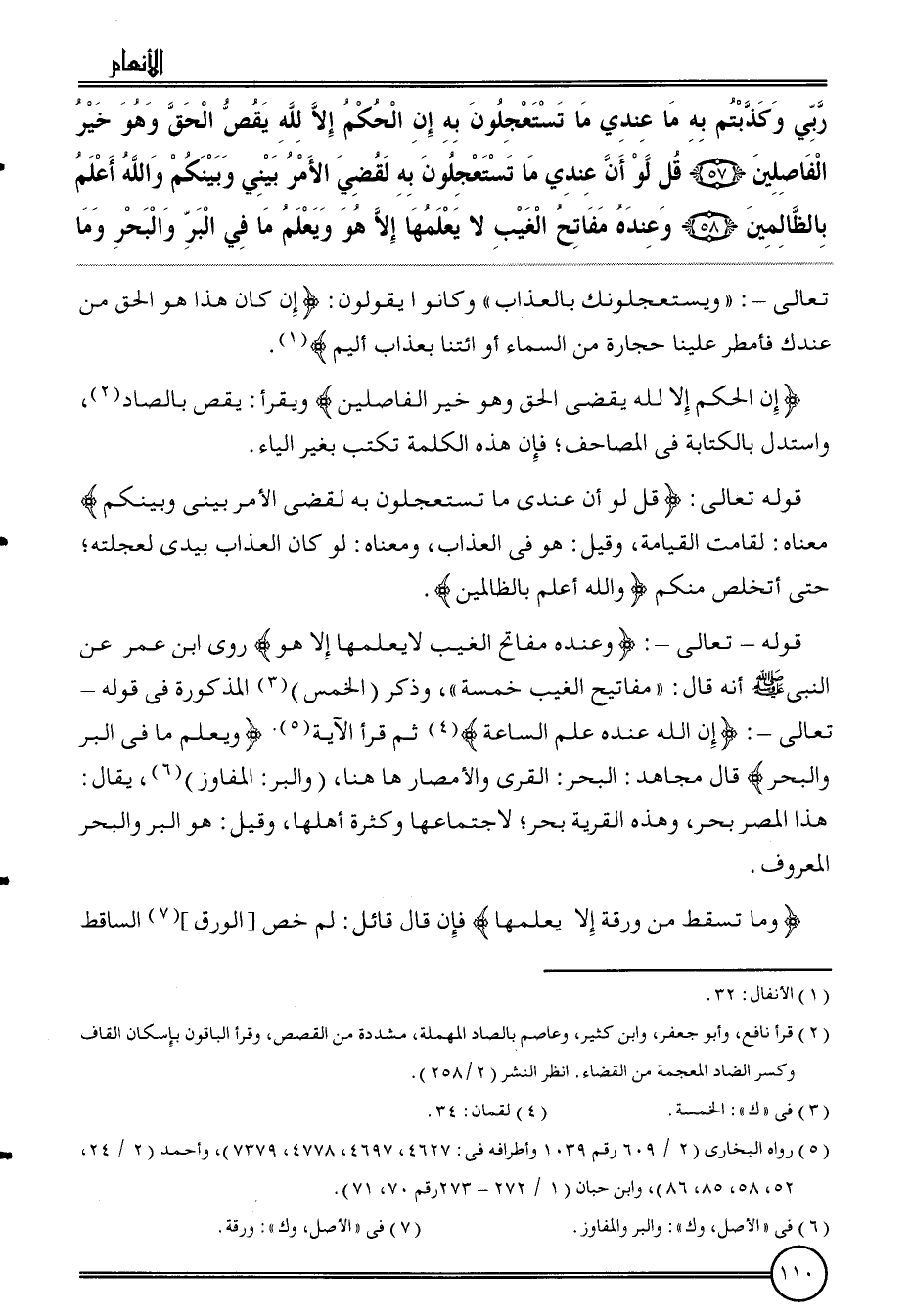 قَوْله - تَعَالَى -: {وَعِنْده مَفَاتِيح الْغَيْب لَا يعلمهَا إِلَّا هُوَ} روى ابْن عمر عَن النَّبِي أَنه قَالَ: " مفاتح الْغَيْب خَمْسَة " وَذكر (الْخمس) الْمَذْكُورَة فِي قَوْله - تَعَالَى -: {إِن الله عِنْده علم السَّاعَة} ثمَّ قَرَأَ الْآيَة. {وَيعلم مَا فِي الْبر وَالْبَحْر} قَالَ مُجَاهِد: الْبَحْر: الْقرى والأمصار هَاهُنَا، (وَالْبر: المفاوز) ، يُقَال: هَذَا الْمصر بَحر، وَهَذِه الْقرْيَة بَحر؛ لاجتماعها وَكَثْرَة أَهلهَا، وَقيل: هُوَ الْبر وَالْبَحْر الْمَعْرُوف.