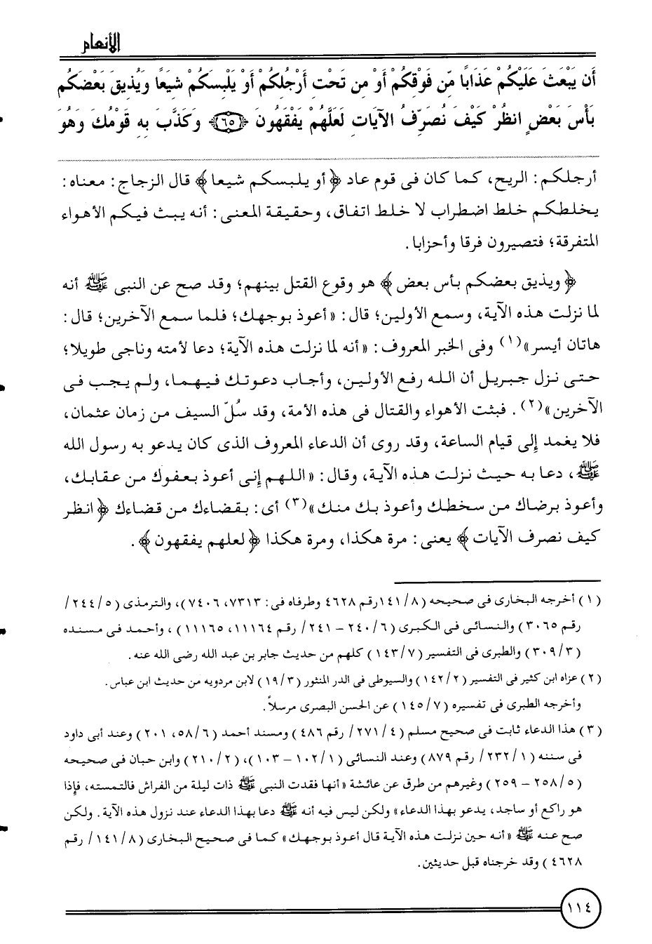 (وَيُذِيق بَعْضكُم بَأْس بعض) هُوَ وُقُوع الْقَتْل بَينهم؛ وَقد صَحَّ عَن النَّبِي أَنه لما نزلت هَذِه الْآيَة، وَسمع الْأَوَّلين؛ قَالَ: " أعوذ بِوَجْهِك؛ فَلَمَّا سمع الآخرين؛ قَالَ: هَاتَانِ أيسر " وَفِي الْخَبَر الْمَعْرُوف: " أَنه لما نزلت هَذِه الْآيَة؛ دَعَا لأمته وناجى طَويلا؛ حَتَّى نزل جِبْرِيل أَن الله رفع الْأَوَّلين، وَأجَاب دعوتك فيهمَا، وَلم يجب فِي الآخرين ". فبثت الْأَهْوَاء والقتال فِي هَذِه الْأمة، وَقد سل السَّيْف من زمَان عُثْمَان، فَلَا يغمد إِلَى قيام السَّاعَة، وَقد روى أَن الدُّعَاء الْمَعْرُوف الَّذِي كَانَ يَدْعُو بِهِ رَسُول الله، دَعَا بِهِ حَيْثُ نزلت هَذِه الْآيَة، وَقَالَ: " اللَّهُمَّ إِنِّي أعوذ بعفوك من عقابك، وَأَعُوذ برضاك من سخطك وَأَعُوذ بك مِنْك " أَي: بقضاءك من قضاءك {انْظُر كَيفَ نصرف الْآيَات} يَعْنِي: مرّة هَكَذَا، وَمرَّة هَكَذَا {لَعَلَّهُم يفقهُونَ} .