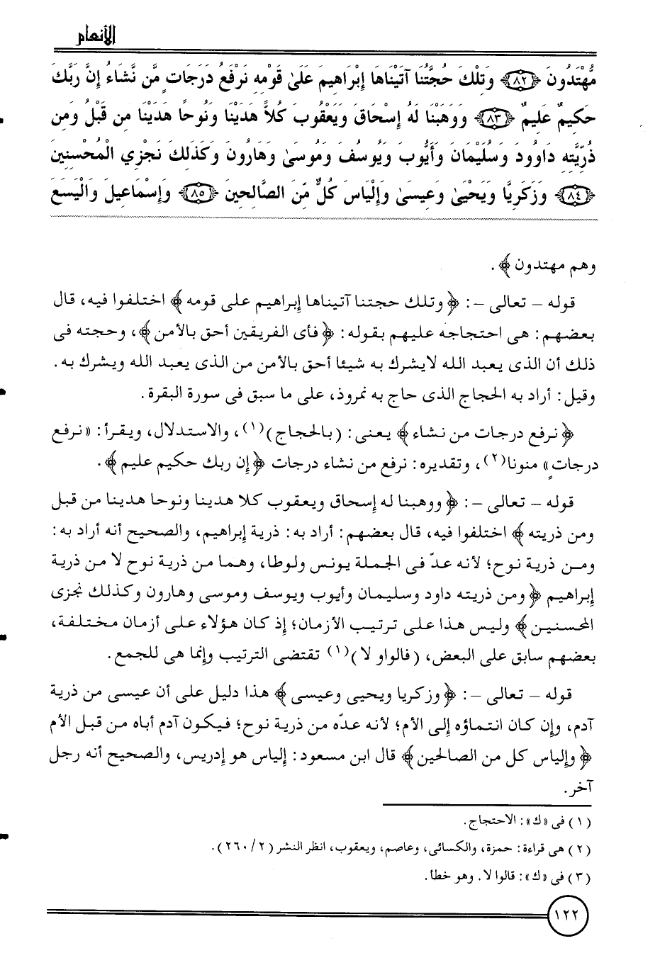 قَوْله - تَعَالَى -: {وَوَهَبْنَا لَهُ إِسْحَاق وَيَعْقُوب كلا هدينَا ونوحا هدينَا من قبل وَمن ذُريَّته} اخْتلفُوا فِيهِ، قَالَ بَعضهم: أَرَادَ بِهِ: ذُرِّيَّة إِبْرَاهِيم، وَالصَّحِيح أَنه أَرَادَ بِهِ: وَمن ذُرِّيَّة نوح؛ لِأَنَّهُ عد فِي الْجُمْلَة يُونُس ولوطا، وهما من ذُرِّيَّة نوح لَا من ذُرِّيَّة إِبْرَاهِيم {وَمن ذُريَّته دَاوُد وَسليمَان وَأَيوب ويوسف ومُوسَى وَهَارُون وَكَذَلِكَ نجزي الْمُحْسِنِينَ} وَلَيْسَ هَذَا على تَرْتِيب الْأَزْمَان؛ إِذْ كَانَ هَؤُلَاءِ على أزمان مُخْتَلفَة، بَعضهم سَابق على الْبَعْض، (فالواو لَا) تَقْتَضِي التَّرْتِيب وَإِنَّمَا هِيَ للْجمع.
