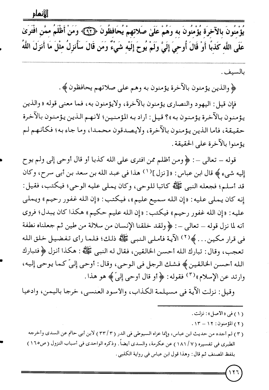 {يُؤمنُونَ بِالآخِرَة يُؤمنُونَ بِهِ وهم على صلَاتهم يُحَافِظُونَ (92) وَمن أظلم مِمَّن افترى على الله كذبا أَو قَالَ أُوحِي إِلَيّ وَلم يُوح إِلَيْهِ شَيْء وَمن قَالَ سَأُنْزِلُ مثل مَا أنزل الله} بِالسَّيْفِ.