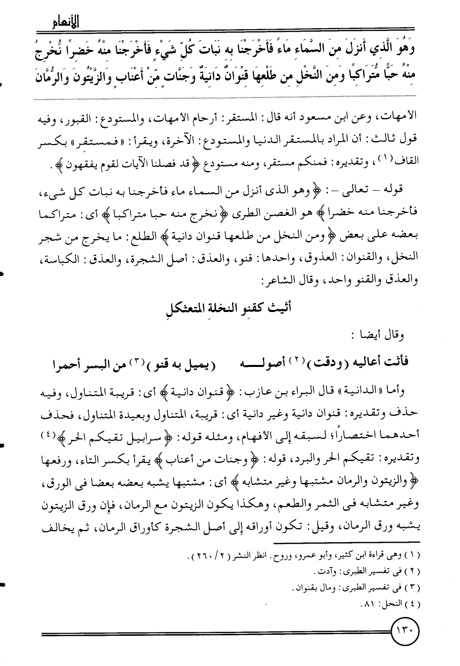 {وَهُوَ الَّذِي أنزل من السَّمَاء مَاء فأخرجنا بِهِ نَبَات كل شَيْء فأخرجنا مِنْهُ خضرًا نخرج مِنْهُ حبا متراكبا وَمن النّخل من طلعها قنوان دانية وجنات من أعناب وَالزَّيْتُون وَالرُّمَّان} الْأُمَّهَات، وَعَن ابْن مَسْعُود أَنه قَالَ: المستقر: أَرْحَام الْأُمَّهَات، والمستودع: الْقُبُور، وَفِيه قَول ثَالِث: أَن المُرَاد بالمستقر الدُّنْيَا والمستودع: الْآخِرَة، وَيقْرَأ: " فمستقر " بِكَسْر الْقَاف، وَتَقْدِيره: فمنكم مُسْتَقر، وَمِنْه مستودع {قد فصلنا الْآيَات لقوم يفقهُونَ} .