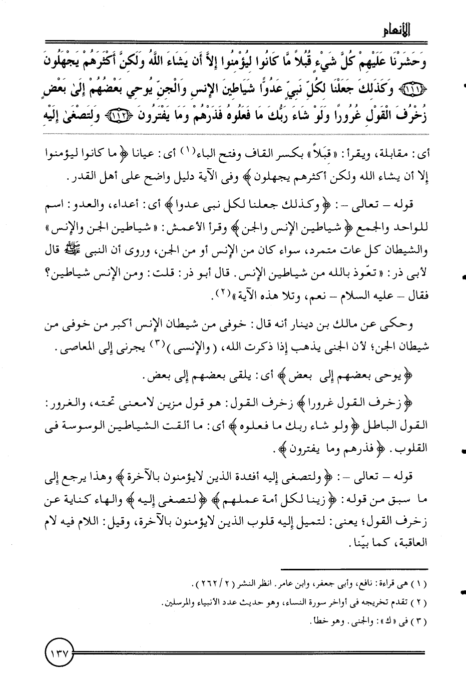 {وحشرنا عَلَيْهِم كل شَيْء قبلا مَا كَانُوا ليؤمنوا إِلَّا أَن يَشَاء الله وَلَكِن أَكْثَرهم يجهلون (111) وَكَذَلِكَ جعلنَا لكل نَبِي عدوا شياطين الْإِنْس وَالْجِنّ يوحي بَعضهم إِلَى بعض زخرف القَوْل غرُورًا وَلَو شَاءَ رَبك مَا فَعَلُوهُ فذرهم وَمَا يفترون (112) ولتصغى إِلَيْهِ} أَي: مُقَابلَة، وَيقْرَأ: " قبلا " بِكَسْر الْقَاف وَفتح الْبَاء أَي: عيَانًا {مَا كَانُوا ليؤمنوا إِلَّا أَن يَشَاء الله وَلَكِن أَكْثَرهم يجهلون} وَفِي الْآيَة دَلِيل وَاضح على أهل الْقدر.