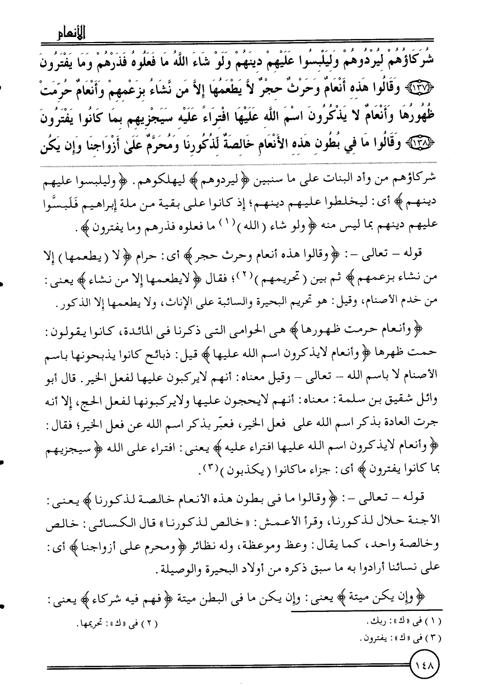 {شركاؤكم ليردوهم وليلبسوا عَلَيْهِم دينهم وَلَو شَاءَ الله مَا فَعَلُوهُ فذرهم وَمَا يفترون (137) وَقَالُوا هَذِه أنعام وحرث حجر لَا يطْعمهَا إِلَّا من نشَاء بزعمهم وأنعام حرمت ظُهُورهَا وأنعام لَا يذكرُونَ اسْم الله عَلَيْهَا افتراء عَلَيْهِ سيجزيهم بِمَا كَانُوا يفترون (138) وَقَالُوا مَا فِي بطُون هَذِه الْأَنْعَام خَالِصَة لذكورنا ومحرم على أَزوَاجنَا وَإِن يكن} شركاؤهم من وأد الْبَنَات على مَا سنبين {ليردوهم} ليهلكوهم. {وليلبسوا عَلَيْهِم دينهم} أَي: ليخلطوا عَلَيْهِم دينهم؛ إِذْ كَانُوا على بَقِيَّة من مِلَّة إِبْرَاهِيم فلبسوا عَلَيْهِم دينهم بِمَا لَيْسَ مِنْهُ {وَلَو شَاءَ (الله} مَا فَعَلُوهُ فذرهم وَمَا يفترون) .