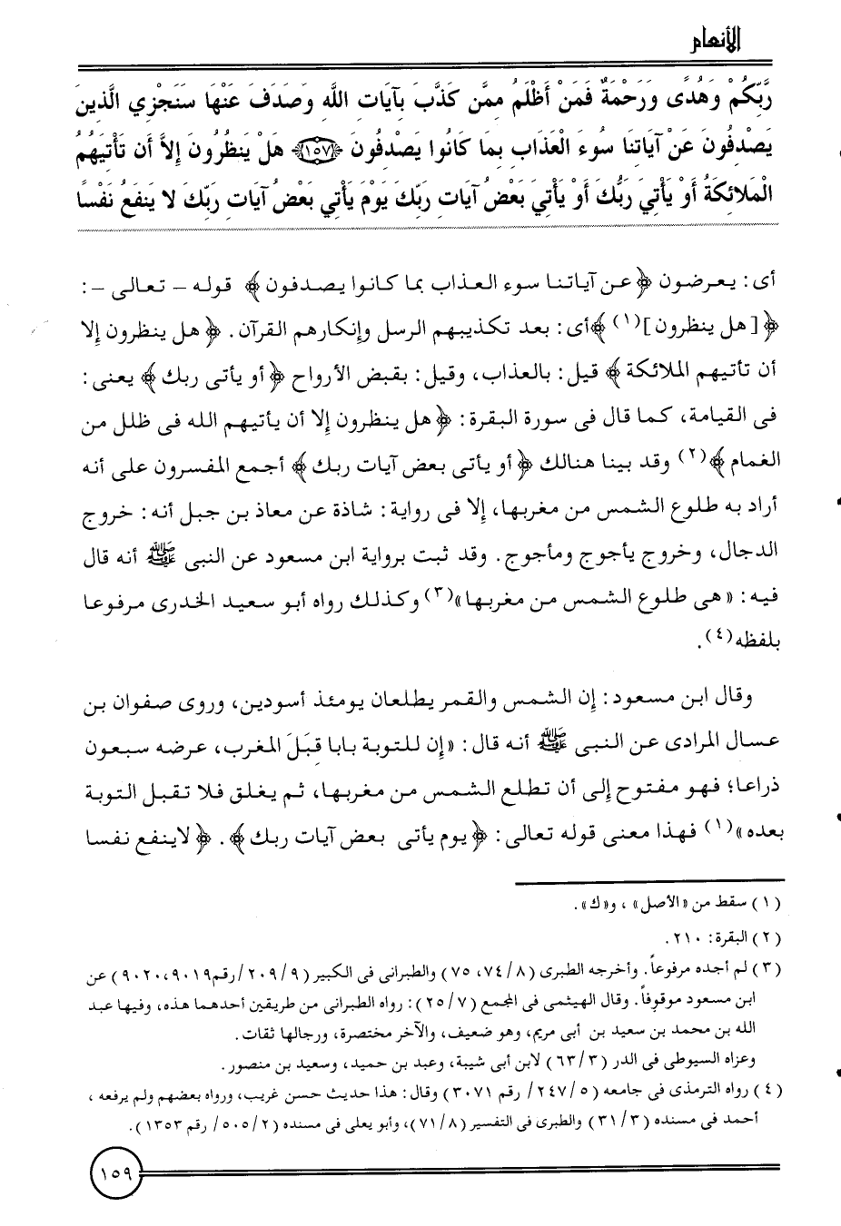 {هَل ينظرُونَ إِلَّا أَن تأتيهم الْمَلَائِكَة} قيل: بِالْعَذَابِ، وَقيل: بِقَبض الْأَرْوَاح (أَو يَأْتِي رَبك) يَعْنِي: فِي الْقِيَامَة، كَمَا قَالَ فِي سُورَة الْبَقَرَة: {هَل ينظرُونَ إِلَّا أَن يَأْتِيهم الله فِي ظلل من الْغَمَام} وَقد بَينا هُنَالك {أَو يَأْتِي بعض آيَات رَبك} أجمع الْمُفَسِّرُونَ على أَنه أَرَادَ بِهِ طُلُوع الشَّمْس من مغْرِبهَا، إِلَّا فِي رِوَايَة: شَاذَّة عَن معَاذ بن جبل أَنه: خُرُوج الدَّجَّال، وَخُرُوج يَأْجُوج وَمَأْجُوج. وَقد ثَبت بِرِوَايَة ابْن مَسْعُود عَن النَّبِي أَنه قَالَ فِيهِ: " هِيَ طُلُوع الشَّمْس من مغْرِبهَا " وَكَذَلِكَ رَوَاهُ أَبُو سعيد الْخُدْرِيّ مَرْفُوعا بِلَفْظِهِ.