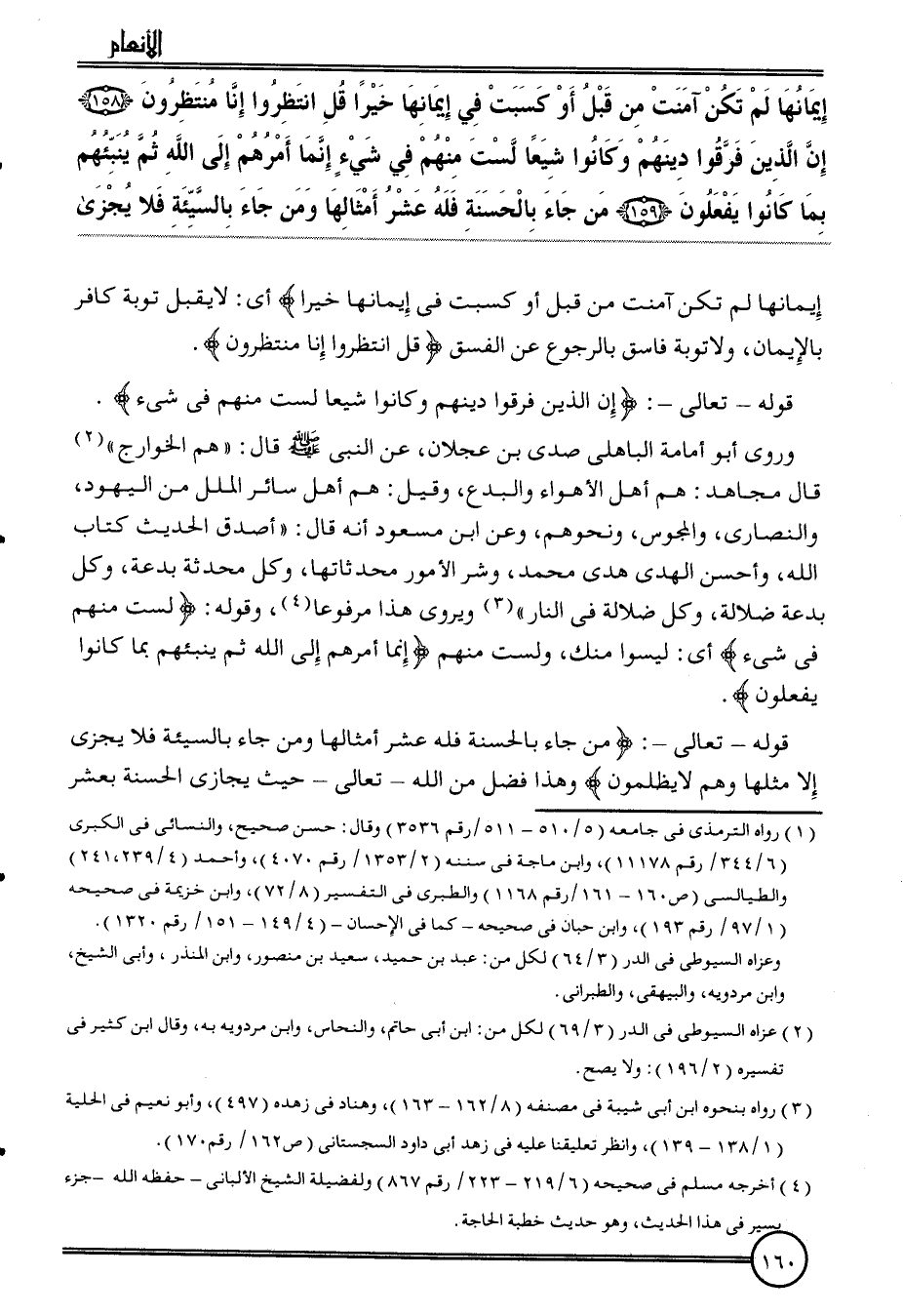 {إيمَانهَا لم تكن آمَنت من قبل أَو كسبت فِي إيمَانهَا خيرا قل انتظروا إِنَّا منتظرون (158) إِن الَّذين فرقوا دينهم وَكَانُوا شيعًا لست مِنْهُم فِي شَيْء إِنَّمَا أَمرهم إِلَى الله ثمَّ ينبئهم بِمَا كَانُوا يَفْعَلُونَ (159) (من جَاءَ بِالْحَسَنَة فَلهُ عشر أَمْثَالهَا وَمن جَاءَ بِالسَّيِّئَةِ فَلَا يجزى إيمَانهَا لم تكن آمَنت من قبل أَو كسبت فِي إيمَانهَا خيرا} أَي: لَا يقبل تَوْبَة كَافِر بِالْإِيمَان، وَلَا تَوْبَة فَاسق بِالرُّجُوعِ عَن الْفسق {قل انتظروا إِنَّا منتظرون} .