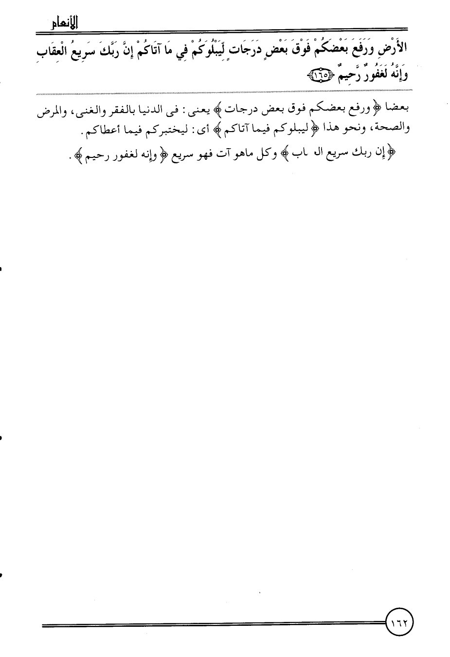 {الأَرْض وَرفع بَعْضكُم فَوق بعض دَرَجَات ليَبْلُوكُمْ فِي مَا آتَاكُم إِن رَبك سريع الْعقَاب وَإنَّهُ لغَفُور رَحِيم (165) } بَعْضًا {وَرفع بَعْضكُم فَوق بعض دَرَجَات} يَعْنِي: فِي الدُّنْيَا بالفقر والغنى، وَالْمَرَض وَالصِّحَّة، وَنَحْو هَذَا {ليَبْلُوكُمْ فِيمَا آتَاكُم} أَي: ليختبروكم فِيمَا أَعْطَاكُم.