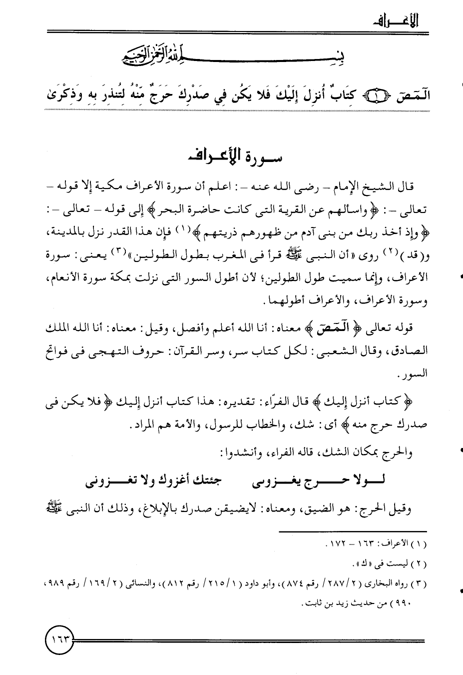 قَالَ الشَّيْخ الإِمَام - رَضِي الله عَنهُ -: اعْلَم أَن سُورَة الْأَعْرَاف مكيه إِلَّا قَوْله - تَعَالَى -: {واسألهم عَن الْقرْيَة الَّتِي كَانَت حَاضِرَة الْبَحْر} إِلَى قَوْله - تَعَالَى -: {وَإِذ أَخذ رَبك من بني آدم من ظُهُورهمْ ذُرِّيتهمْ} فَإِن هَذَا الْقدر نزل بِالْمَدِينَةِ، و (قد) روى " أَن النَّبِي قَرَأَ فِي الْمغرب بطول الطولين " يَعْنِي: سُورَة الْأَعْرَاف، وَإِنَّمَا سميت طول الطولين؛ لِأَن أطول السُّور الَّتِي نزلت بِمَكَّة سُورَة الْأَنْعَام، وَسورَة الْأَعْرَاف، والأعراف أطولهما.