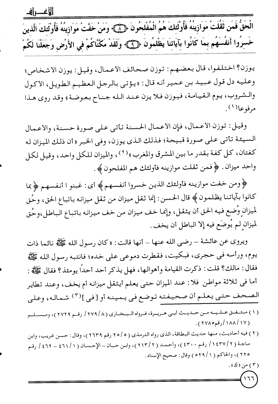وَقيل: توزن الْأَعْمَال، فَإِن الْأَعْمَال الْحَسَنَة تَأتي على صُورَة حَسَنَة، والأعمال السَّيئَة تَأتي على صُورَة قبيحة؛ فَذَلِك الَّذِي يُوزن، وَفِي الْخَبَر " أَن ذَلِك الْمِيزَان لَهُ كفتان، كل كفة بِقدر مَا بَين الْمشرق وَالْمغْرب "، وَالْمِيزَان للْكُلّ وَاحِد، وَقيل لكل وَاحِد ميزَان. {فَمن ثقلت مَوَازِينه فَأُولَئِك هم المفلحون} .
