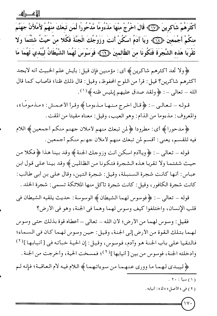 {أَكْثَرهم شاكرين (17) قَالَ اخْرُج مِنْهَا مذءوما مَدْحُورًا لمن تبعك مِنْهُم لأملأن جَهَنَّم مِنْكُم أَجْمَعِينَ (18) وَيَا آدم اسكن أَنْت وزوجك الْجنَّة فكلا من حَيْثُ شئتما وَلَا تقربا هَذِه الشَّجَرَة فتكونا من الظَّالِمين (19) فوسوس لَهما الشَّيْطَان ليبدي لَهما مَا}