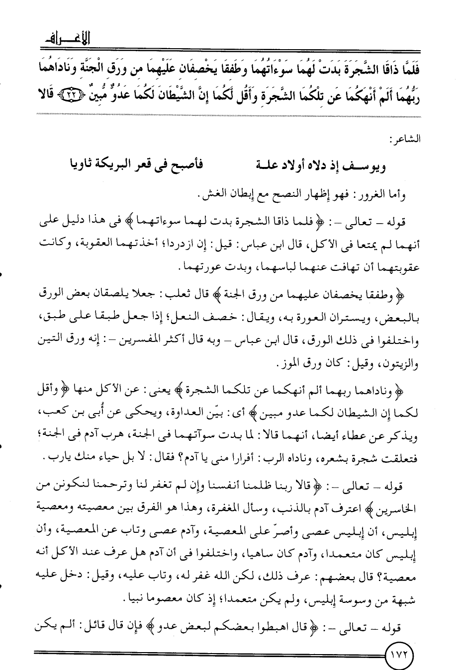 {فَلَمَّا ذاقا الشَّجَرَة بَدَت لَهما سوءاتهما وطفقا يخصفان عَلَيْهِمَا من ورق الْجنَّة وناداهما ربهما ألم أنهكما عَن تلكما الشَّجَرَة وَأَقل لَكمَا إِن الشَّيْطَان لَكمَا عَدو مُبين (22) قَالَا} الشَّاعِر:
