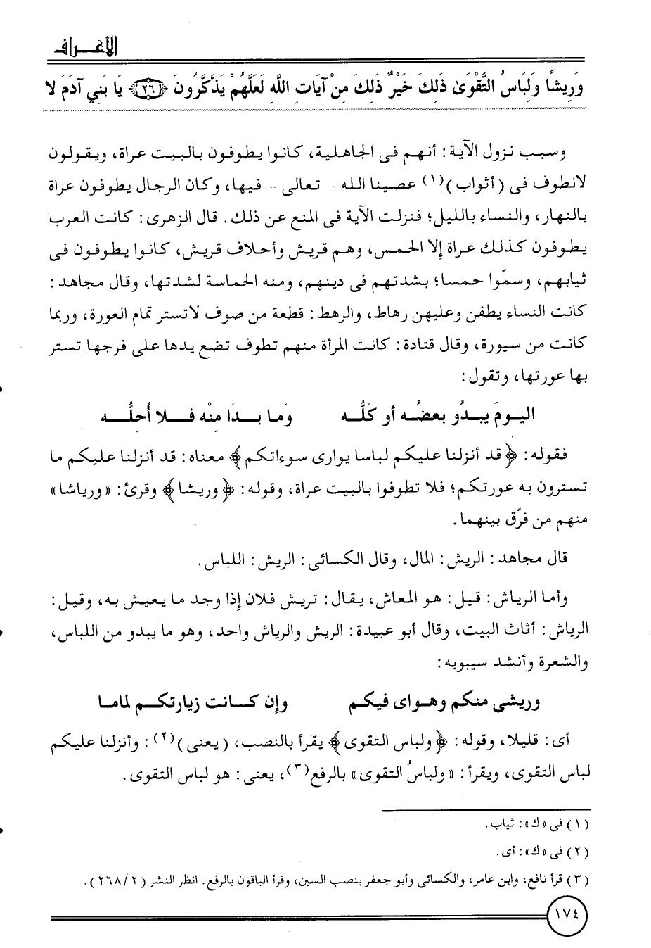 فَقَوله: {قد أنزلنَا عَلَيْكُم لباسا يواري سوءاتكم} مَعْنَاهُ: قد أنزلنَا عَلَيْكُم مَا تسترون بِهِ عورتكم؛ فَلَا تطوفوا بِالْبَيْتِ عُرَاة، وَقَوله: {وريشا} وَقُرِئَ: " ورياشا " مِنْهُم من فرق بَينهمَا.