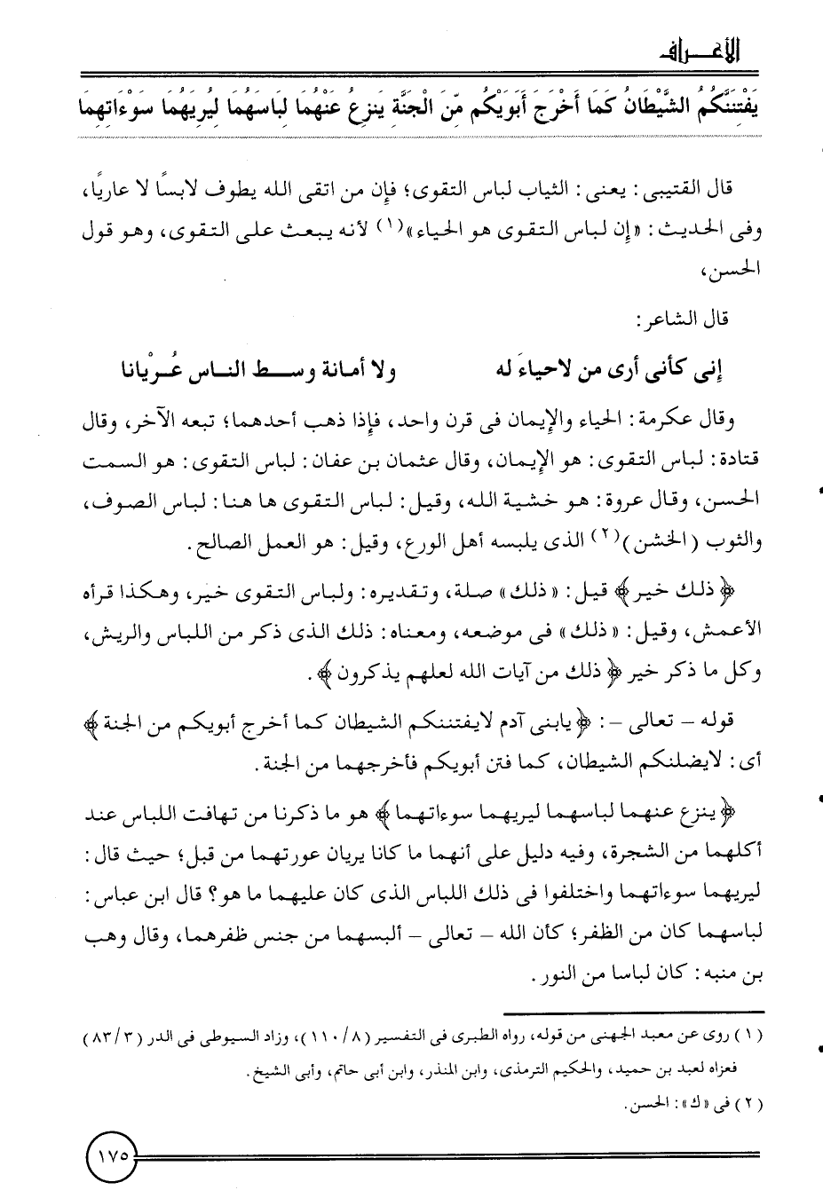 قَالَ القتيبي: يَعْنِي: الثِّيَاب لِبَاس التَّقْوَى؛ فَإِن من اتَّقى الله يطوف لابسا لَا عَارِيا، وَفِي الحَدِيث: " إِن لِبَاس التَّقْوَى هُوَ الْحيَاء " لِأَنَّهُ يبْعَث على التَّقْوَى، وَهُوَ قَول الْحسن،