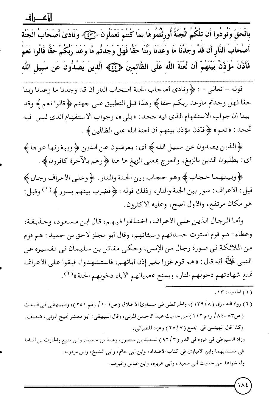 وَأما الرِّجَال الَّذين على الْأَعْرَاف، اخْتلفُوا فيهم، قَالَ ابْن مَسْعُود، وَحُذَيْفَة، وَعَطَاء: هم قوم اسْتَوَت حسناتهم وسيئاتهم، وَقَالَ أَبُو مجلز لَاحق بن حميد، هم قوم من الْمَلَائِكَة فِي صُورَة رجال من الْإِنْس، وَحكى مقَاتل بن سُلَيْمَان فِي تَفْسِيره عَن النَّبِي أَنه قَالَ: " هم قوم غزوا بِغَيْر إِذن آبَائِهِم، فاستشهدوا، فبقوا على الْأَعْرَاف تمنع شَهَادَتهم دُخُولهمْ النَّار، وَيمْنَع عصيانهم الْآبَاء دُخُولهمْ الْجنَّة ".