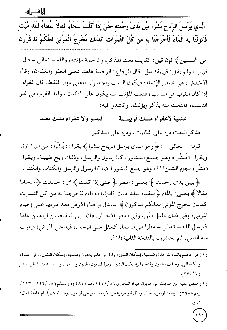 {الَّذِي يُرْسل الرِّيَاح بشرا بَين يَدي رَحمته حَتَّى إِذا أقلت سَحَاب اثقالا سقناه لبلد ميت فأنزلنا بِهِ المَاء فأخرجنا بِهِ من كل الثمرات كَذَلِك نخرج الْمَوْتَى لَعَلَّكُمْ تذكرُونَ} من الْمُحْسِنِينَ) فَإِن قيل: الْقَرِيب نعت الْمُذكر، وَالرَّحْمَة مُؤَنّثَة، وَالله - تَعَالَى - قَالَ: قريب، وَلم يقل: قريبَة؛ قيل: قَالَ الزّجاج: الرَّحْمَة هَاهُنَا بِمَعْنى الْعَفو والغفران، وَقَالَ الْأَخْفَش: هِيَ بِمَعْنى الإنعام؛ فَيكون النَّعْت رَاجعا إِلَى الْمَعْنى دون اللَّفْظ، قَالَ الْفراء: إِذا كَانَ الْقرب فِي النّسَب؛ فنعت الْمُؤَنَّث مِنْهُ يكون على التَّأْنِيث، وَأما الْقرب فِي غير النّسَب؛ فالنعت مِنْهُ يذكر وَيُؤَنث، وانشدوا فِيهِ: