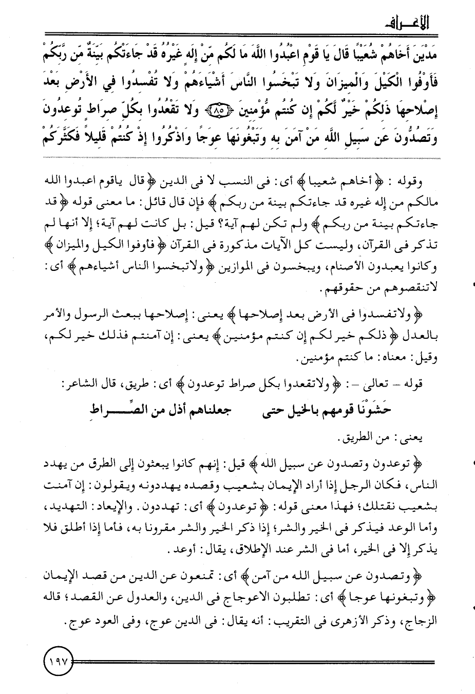 {مَدين أَخَاهُم شعيبا قَالَ يَا قوم اعبدوا الله من لكم من إِلَه غَيره قد جاءتكم بَيِّنَة من ربكُم فأوفوا الْكَيْل وَالْمِيزَان وَلَا تبخسوا النَّاس أشياءهم وَلَا تفسدوا فِي الأَرْض بعد إصلاحها ذَلِكُم خير لكم إِن كُنْتُم مُؤمنين (85) وَلَا تقعدوا بِكُل صِرَاط توعدون وتصدون عَن سَبِيل الله من آمن بِهِ وتبغونها عوجا واذْكُرُوا إِذْ كُنْتُم قَلِيلا فكثركم}