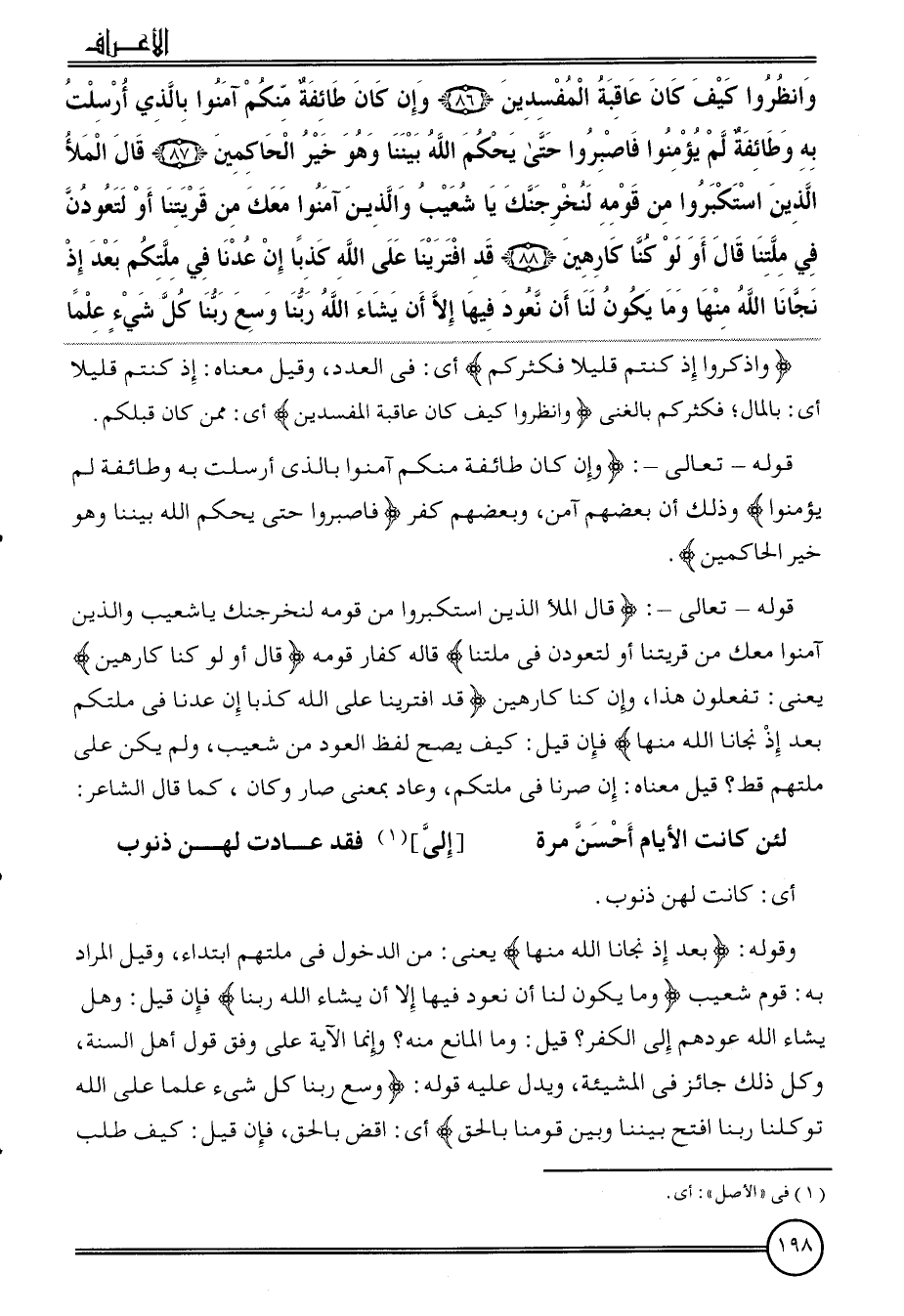 {وانظروا كَيفَ كَانَ عَاقِبَة المفسدين (86) وَإِن كَانَ طَائِفَة مِنْكُم آمنُوا بِالَّذِي أرْسلت بِهِ وَطَائِفَة لم يُؤمنُوا فَاصْبِرُوا حَتَّى يحكم الله بَيْننَا وَهُوَ خير الْحَاكِمين (87) قَالَ الْمَلأ الَّذين استكبروا من قومه لنخرجنك يَا شُعَيْب وَالَّذين آمنُوا مَعَك من قريتنا أَو لتعودن فِي ملتنا قَالَ أَو لَو كُنَّا كارهين (88) قد افترينا على الله كذبا إِن عدنا فِي ملتكم بعد إِذْ نجانا الله مِنْهَا وَمَا يكون لنا أَن نعود فِيهَا إِلَّا أَن يَشَاء الله رَبنَا وسع رَبنَا كل شَيْء علما}