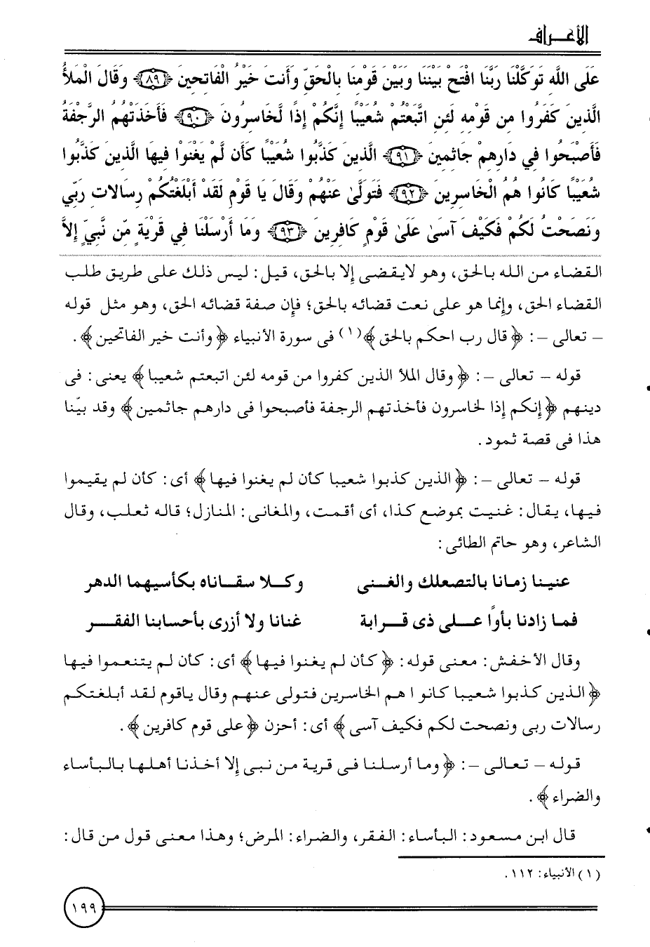 {على الله توكلنا رَبنَا افْتَحْ بَيْننَا وَبَين قَومنَا بِالْحَقِّ وَأَنت خير الفاتحين (89) وَقَالَ الْمَلأ الَّذين كفرُوا من قومه لَئِن اتبعتم شعيبا إِنَّكُم إِذا لخاسرون (90) فَأَخَذتهم الرجفة فَأَصْبحُوا فِي دَارهم جاثمين (91) الَّذين كذبُوا شعيبا كَأَن لم يغنوا فِيهَا الَّذين كذبُوا شعيبا كَانُوا هم الخاسرين (92) فَتَوَلّى عَنْهُم وَقَالَ يَا قوم لقد أبلغتكم رسالات رَبِّي وَنَصَحْت لكم فَكيف آسى على قوم كَافِرين (93) وَمَا أرسلنَا فِي قَرْيَة من نَبِي إِلَّا} الْقَضَاء من الله بِالْحَقِّ، وَهُوَ لَا يقْضِي إِلَّا بِالْحَقِّ، وَقيل: لَيْسَ ذَلِك على طَرِيق طلب الْقَضَاء الْحق، وَإِنَّمَا هُوَ على نعت قَضَائِهِ بِالْحَقِّ؛ فَإِن صفة قَضَائِهِ الْحق، وَهُوَ مثل قَوْله - تَعَالَى -: {قَالَ رب احكم بِالْحَقِّ} فِي سُورَة الْأَنْبِيَاء {وَأَنت خير الفاتحين} .