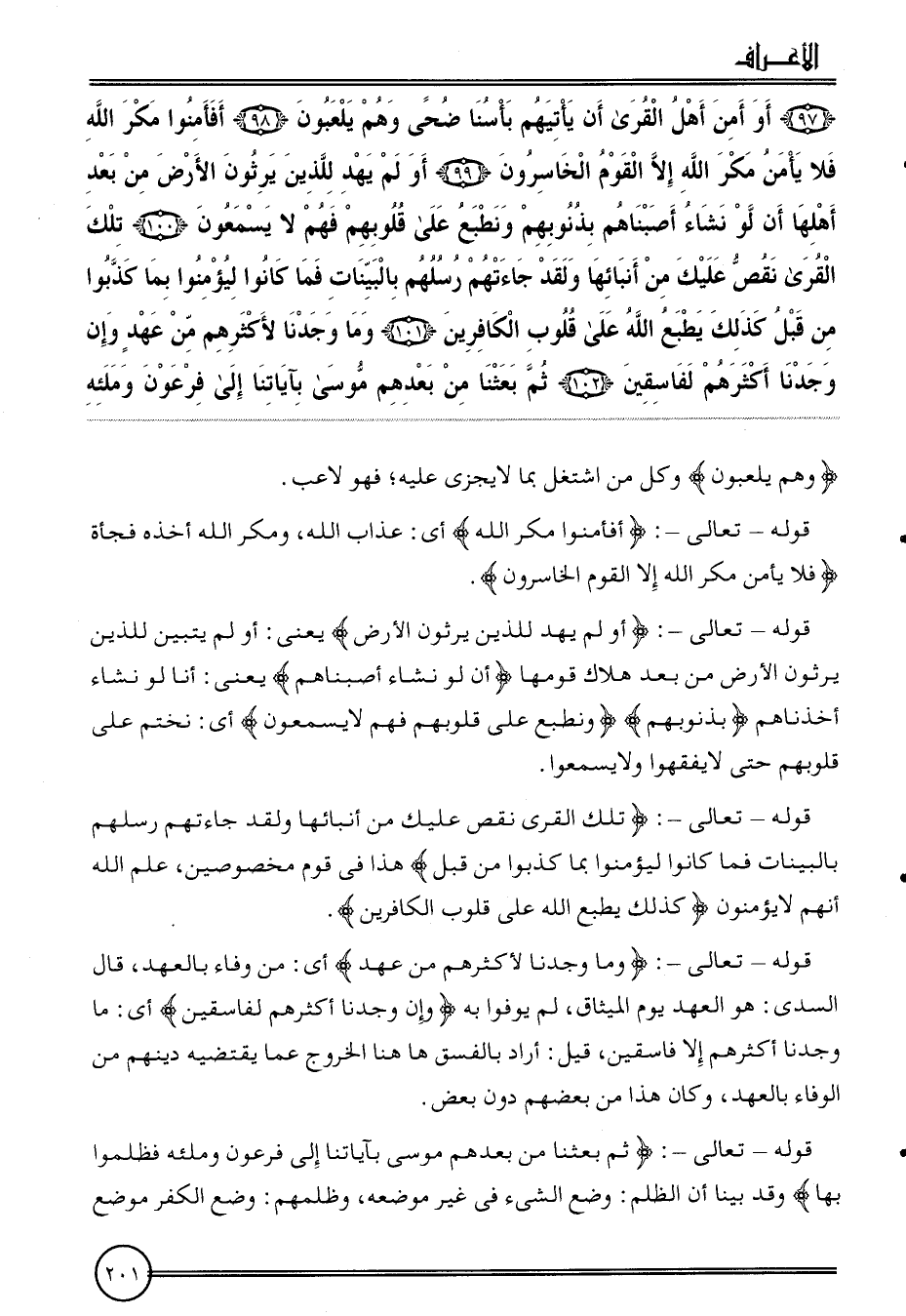 ( {97) أَو أَمن أهل الْقرى أَن يَأْتِيهم بأسنا ضحى وهم يَلْعَبُونَ (98) أفأمنوا مكر الله فَلَا يَأْمَن مكر الله إِلَّا الْقَوْم لخاسرون (99) أَو لم يهد للَّذين يَرِثُونَ الأَرْض من بعد أَهلهَا أَن لَو نشَاء أصبناهم بِذُنُوبِهِمْ ونطبع على قُلُوبهم فهم لَا يسمعُونَ (100) تِلْكَ الْقرى نقص عَلَيْك من أنبائها وَلَقَد جَاءَتْهُم رسلهم بِالْبَيِّنَاتِ فَمَا كَانُوا ليؤمنوا بِمَا كذبُوا من قبل كَذَلِك يطبع الله على قُلُوب الْكَافرين (101) وَمَا وجدنَا لأكثرهم من عهد وَإِن وجدنَا أَكْثَرهم لفاسقين (102) ثمَّ بعثنَا من بعدهمْ مُوسَى بآيتنا إِلَى فِرْعَوْن وملئه} {وهم يَلْعَبُونَ} وكل من اشْتغل بِمَا لَا يجزى عَلَيْهِ؛ فَهُوَ لاعب.