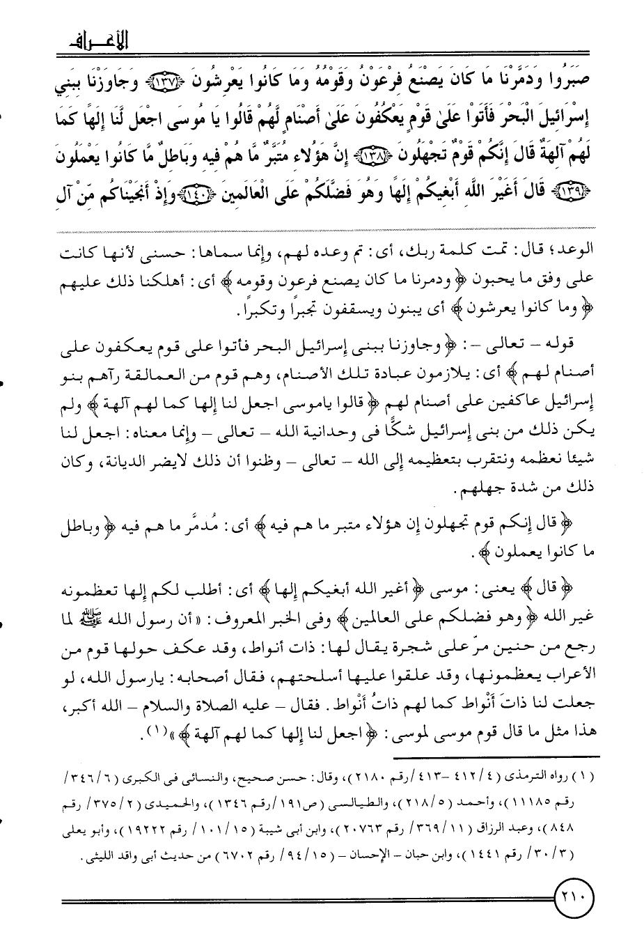 قَوْله - تَعَالَى -: {وجاوزنا ببني إِسْرَائِيل الْبَحْر فَأتوا على قوم يعكفون على أصنام لَهُم} أَي: يلازمون عبَادَة تِلْكَ الْأَصْنَام، وهم قوم من العمالقة رَآهُمْ بَنو إِسْرَائِيل عاكفين على أصنام لَهُم {قَالُوا يَا مُوسَى اجْعَل لنا إِلَهًا كَمَا لَهُم آلِهَة} وَلم يكن ذَلِك من بني إِسْرَائِيل شكا فِي وحدانية الله - تَعَالَى - وَإِنَّمَا مَعْنَاهُ: اجْعَل لنا شَيْئا نعظمه ونتقرب بتعظيمه إِلَى الله - تَعَالَى - وظنوا أَن ذَلِك لَا يضر الدّيانَة، وَكَانَ ذَلِك من شدَّة جهلهم.