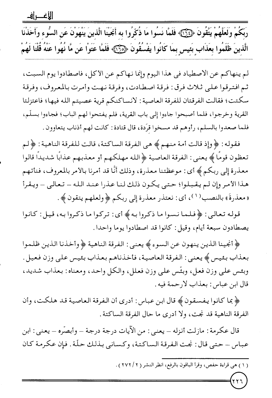{ربكُم ولعلهم يَتَّقُونَ (164) فَلَمَّا نسوا مَا ذكرُوا بِهِ أنجينا الَّذين ينهون عَن السوء وأخذنا الَّذين ظلمُوا بِعَذَاب بئيس بِمَا كَانُوا يفسقون (165) فَلَمَّا عتوا عَن مَا نهوا عَنهُ قُلْنَا لَهُم} لم يَنْهَاكُم عَن الِاصْطِيَاد فِي هَذَا الْيَوْم وَإِنَّمَا نهاكم عَن الْأكل، فاصطادوا يَوْم السبت، ثمَّ افْتَرَقُوا على ثَلَاث فرق: فرقة اصطادت، وَفرْقَة نهت وَأمرت بِالْمَعْرُوفِ، وَفرْقَة سكتت؛ فَقَالَت الفرقتان للفرقة العاصية: لَا نساكنكم قَرْيَة عصيتم الله فِيهَا؛ فاعتزلنا الْقرْيَة وَخَرجُوا، فَلَمَّا أَصْبحُوا جَاءُوا إِلَى بَاب الْقرْيَة، فَلم يفتحوا لَهُم الْبَاب؛ فَجَاءُوا بسلم، فَلَمَّا صعدوا بالسلم، رَأَوْهُمْ قد مسخوا قردة، قَالَ قَتَادَة: كَانَت لَهُم أَذْنَاب يتعادون.