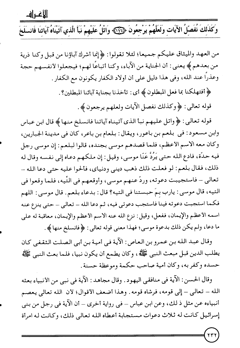 قَوْله تَعَالَى: {واتل عَلَيْهِم نبأ الَّذِي آتيناه آيَاتنَا فانسلخ مِنْهَا} قَالَ ابْن عَبَّاس وَابْن مَسْعُود: فِي بلعم بن باعور، وَيُقَال: بلعام بن باعر، كَانَ فِي مَدِينَة الجبارين، وَكَانَ مَعَه الِاسْم الْأَعْظَم، فَلَمَّا قصدهم مُوسَى بجنده، قَالُوا لبلعم: إِن مُوسَى رجل فِيهِ حِدة، فَادع الله حَتَّى يرد عَنَّا مُوسَى، وَقيل: إِن ملكهم دَعَاهُ إِلَى نَفسه وَقَالَ لَهُ ذَلِك، فَقَالَ بلعم: لَو فعلت ذَلِك ذهب ديني ودنياي، فألحوا عَلَيْهِ حَتَّى دَعَا الله - تَعَالَى - فاستجيبت دَعوته، ورد عَنْهُم مُوسَى، وأوقعهم فِي التيه، فَلَمَّا وَقَعُوا فِي التيه، قَالَ مُوسَى: يَا رب بِمَ حبستنا فِي التيه؟ قَالَ: بِدُعَاء بلعم. قَالَ مُوسَى: اللَّهُمَّ فَكَمَا استجبت دَعوته فِينَا فاستجب دَعْوَتِي فِيهِ، ثمَّ دَعَا الله - تَعَالَى - حَتَّى ينْزع عَنهُ اسْمه الْأَعْظَم وَالْإِيمَان، فَفعل، وَقيل: نزع الله عَنهُ الِاسْم الْأَعْظَم وَالْإِيمَان، معاقبة لَهُ على مَا دَعَا، وَلم يكن ذَلِك بدعوة مُوسَى؛ فَهَذَا معنى قَوْله تَعَالَى: {فانسلخ مِنْهَا} .